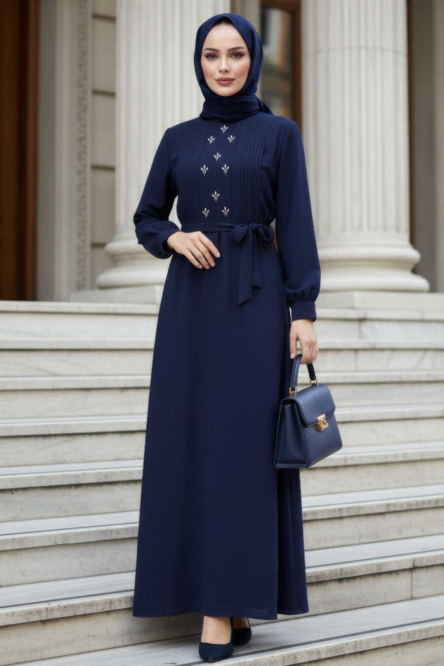 Belted Navy Blue Modest Dress 10309L