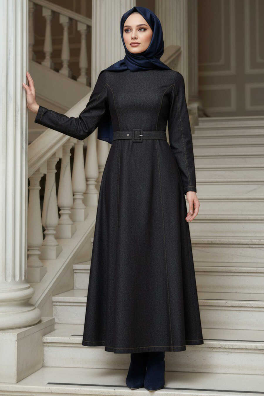 Buckle Belted Black Modest Denim Dress 6283S