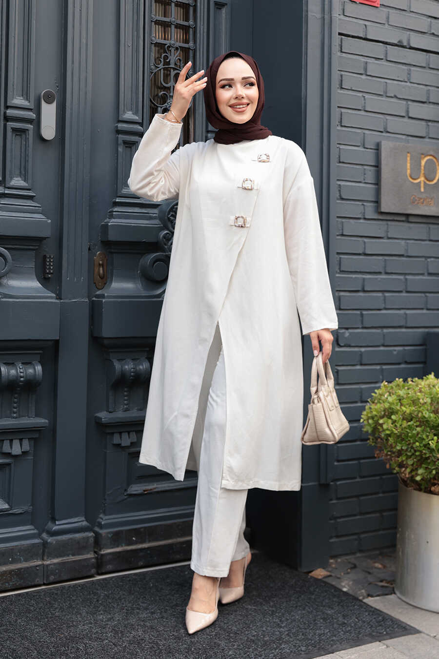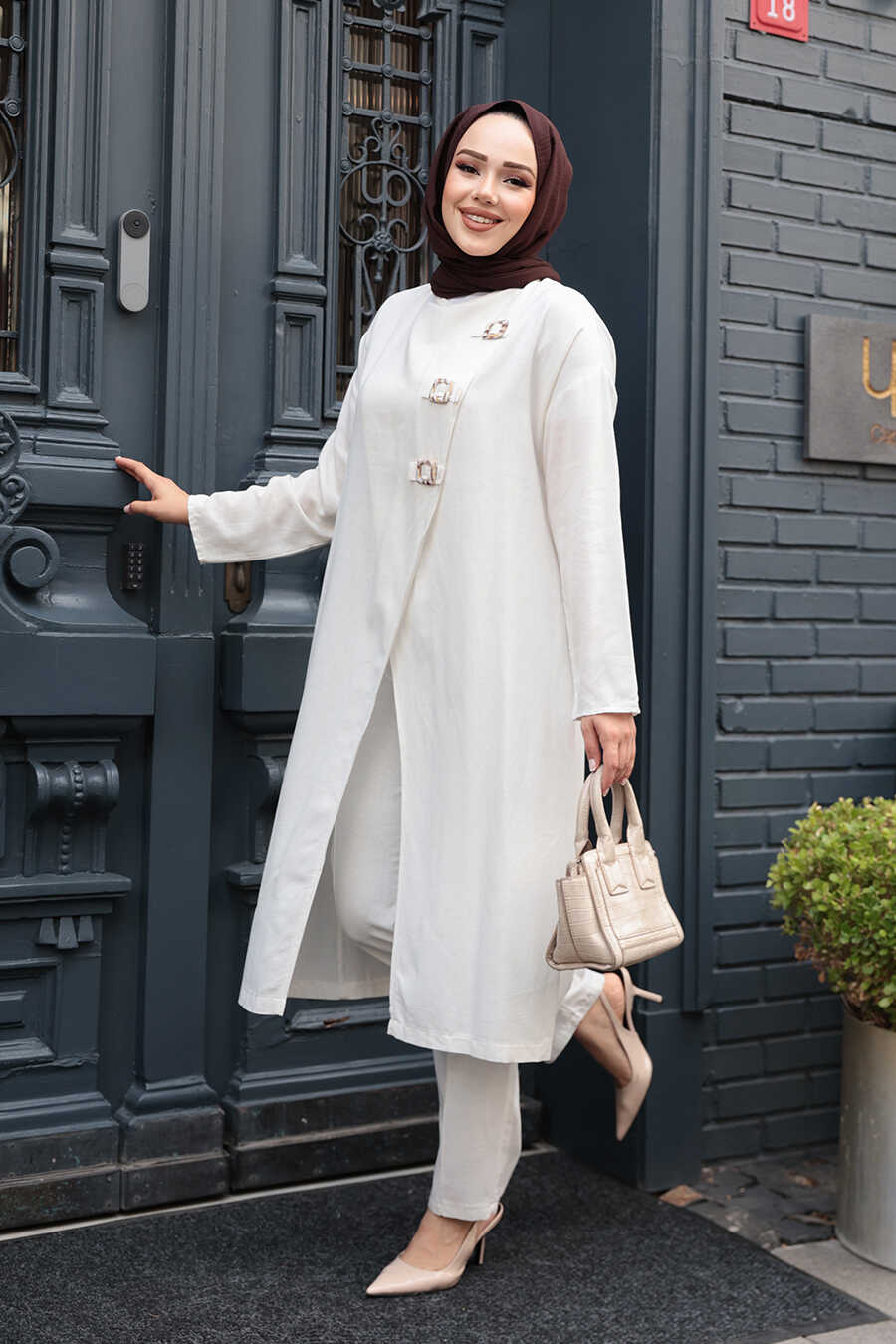 Buckle Detailed Ecru Modest Two-Piece Set 7675E