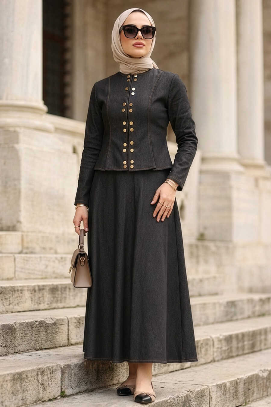 Button Detailed Black Modest Denim Two-Piece Set 11891S