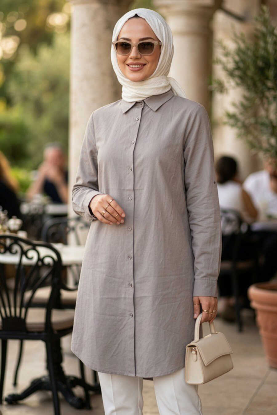 Buttoned Beige Modest Tunic 11751BEJ