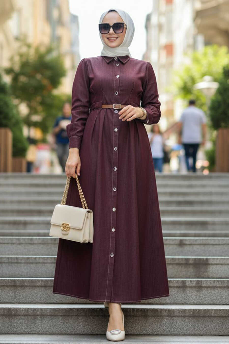 Buttoned Burgundy Modest Denim Dress 19172BR
