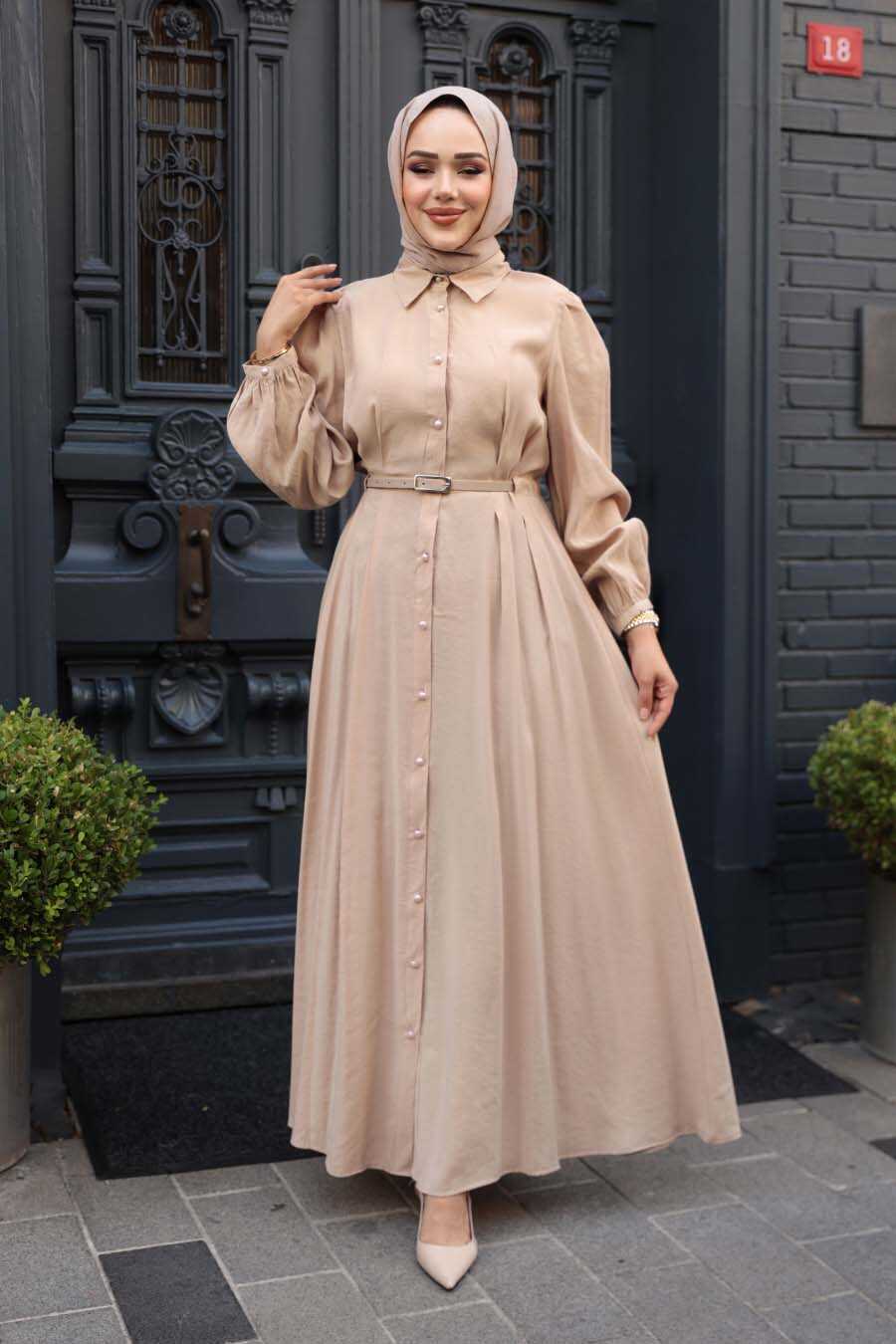 Buttoned Dark Beige Modest Dress 19044KBEJ