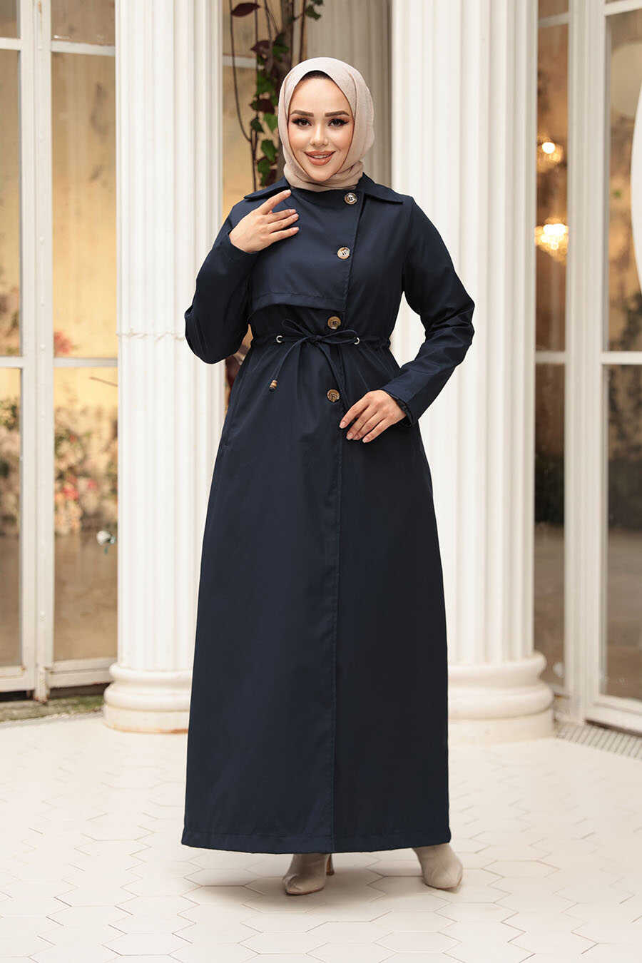 Buttoned Navy Blue Modest Trench Coat 62231L