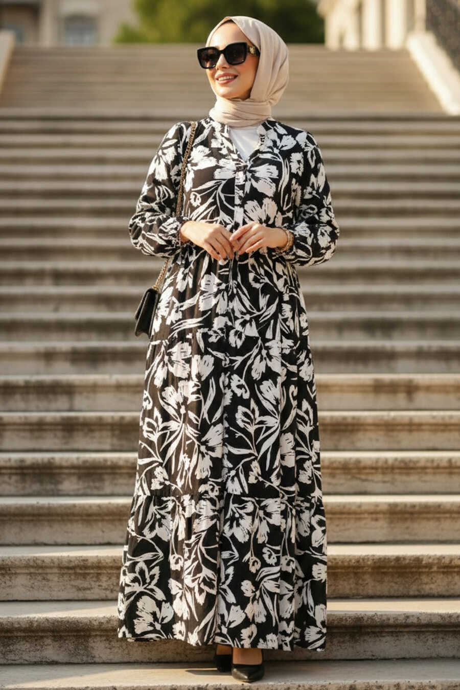 Floral Patterned Black Modest Dress 30131S