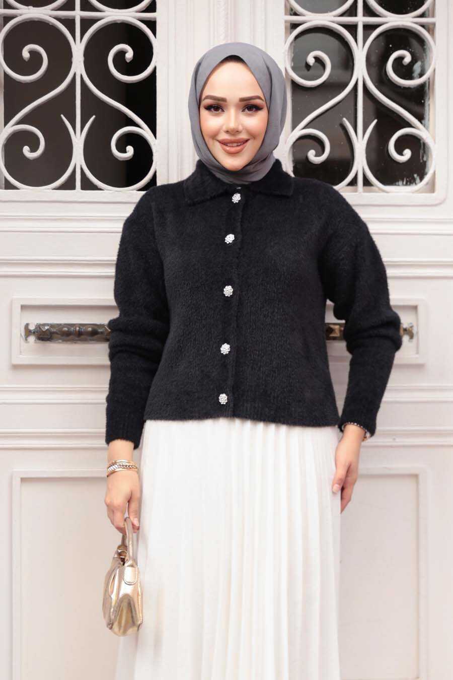 Fluffy Black Knit Modest Cardigan 85321S
