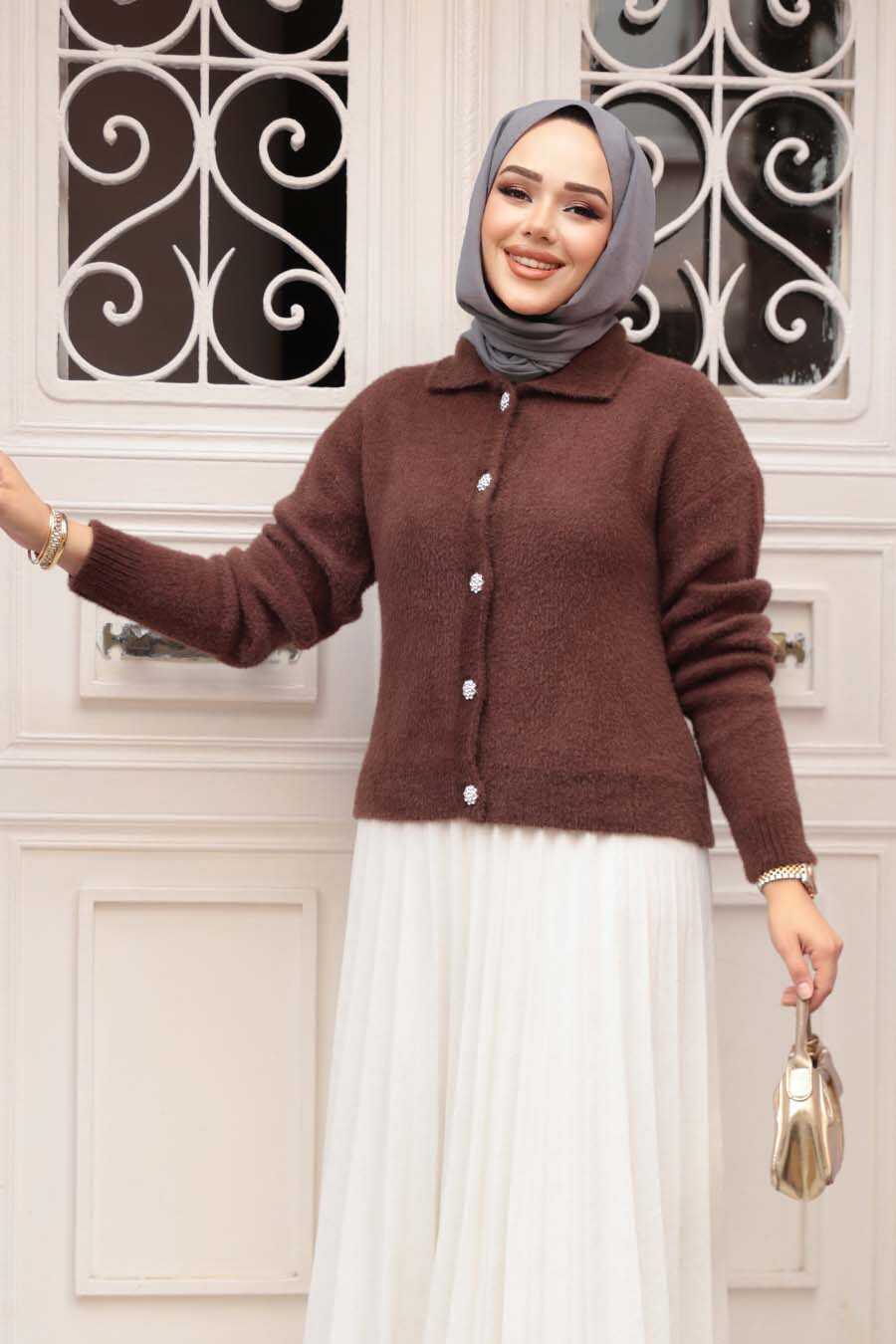 Fluffy Brown Knit Modest Cardigan 85321KH