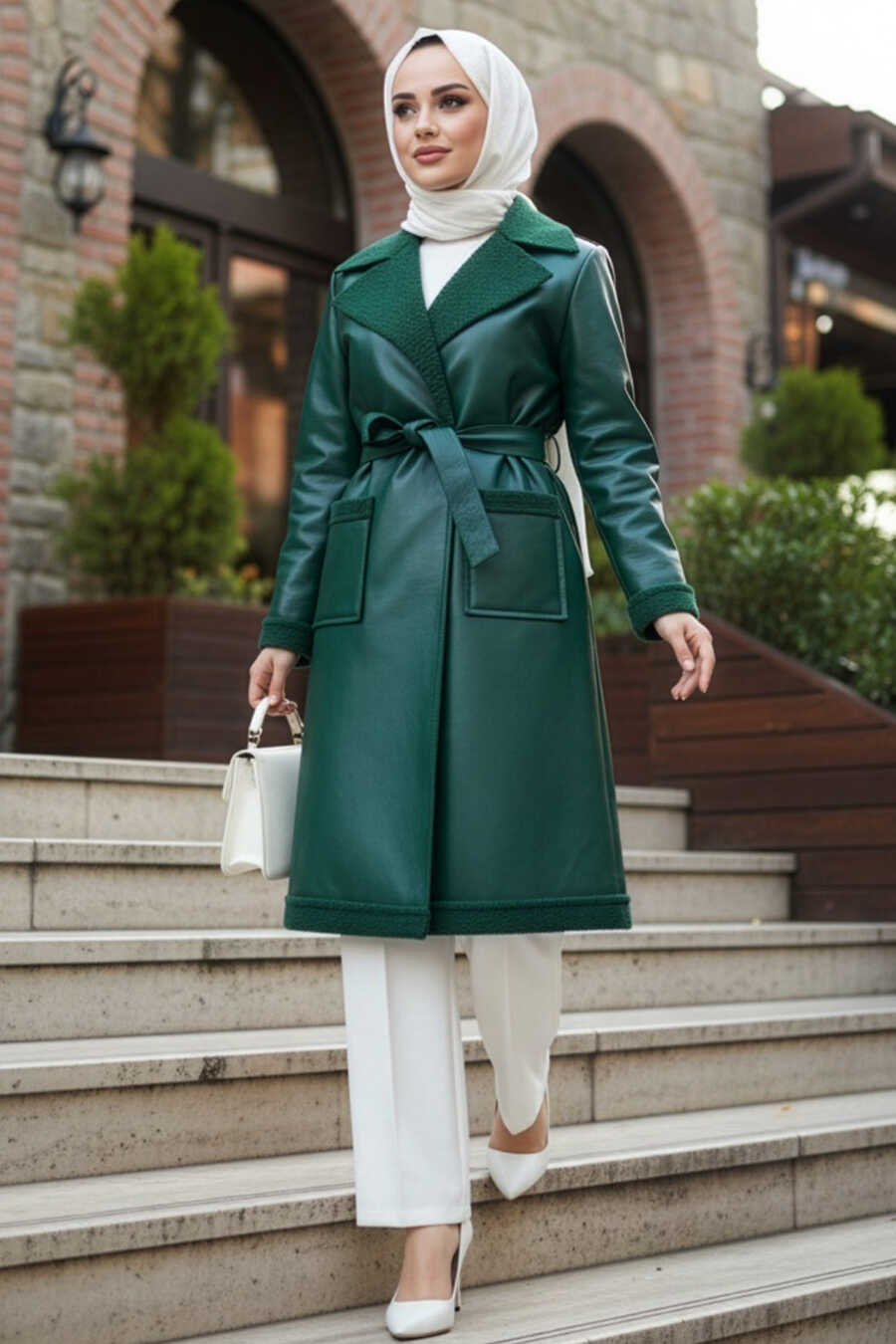 Fur Detailed Green Modest Faux Leather Coat 62391Y