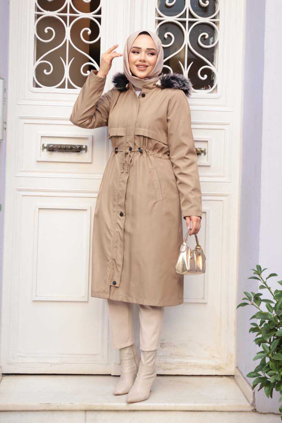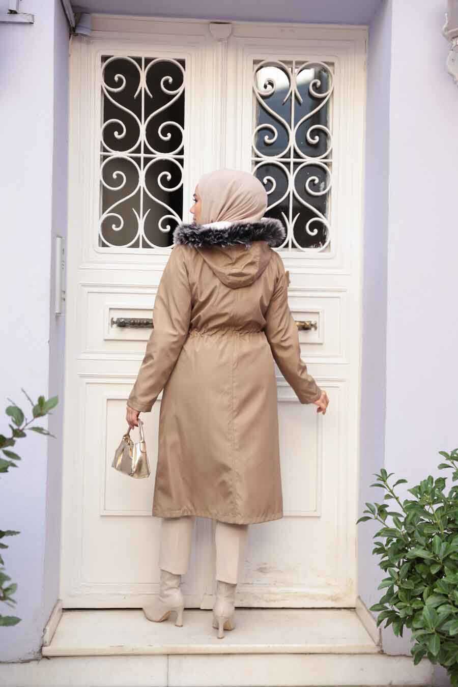 Ürün Özelliği: Dik yaka, kürklü kapüşonlu, uzun kollu, kol ucu lastikli, yanlardan düğme kapamalı cepli, ön ortadan gizli fermuarlı ve düğme kapamalıdır.