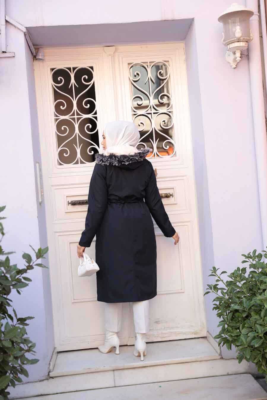 Fur Hooded Navy Blue Modest Parka 60650L