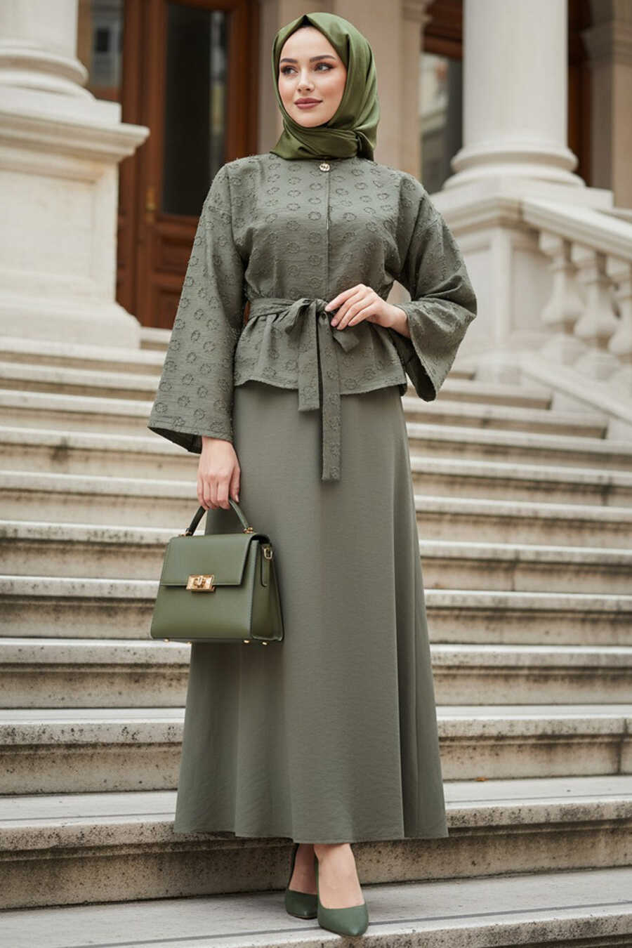 Jacquard Belted Almond Green Modest Two-Piece Set 22026CY