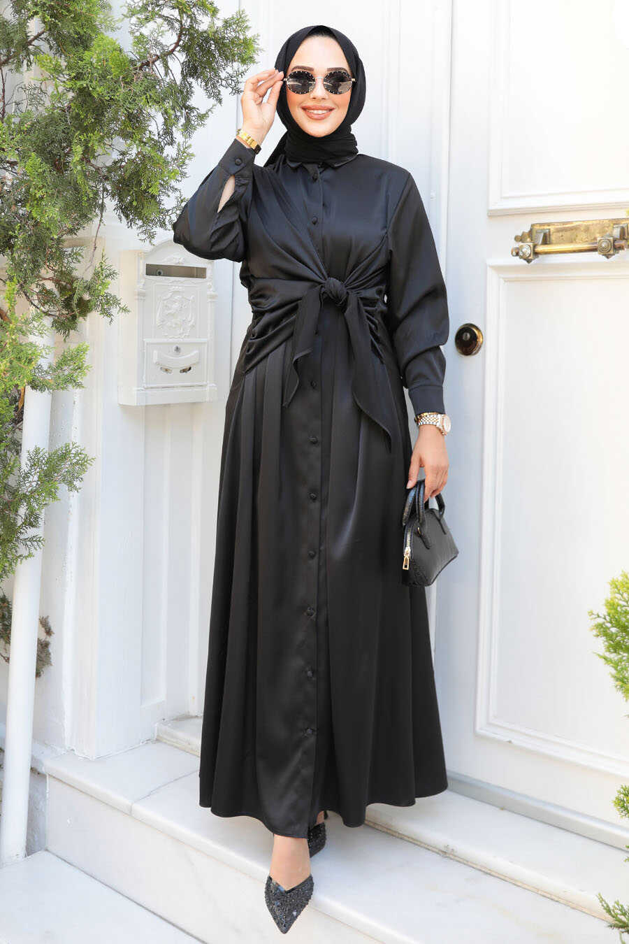 Modest Black Satin Dress 61021S