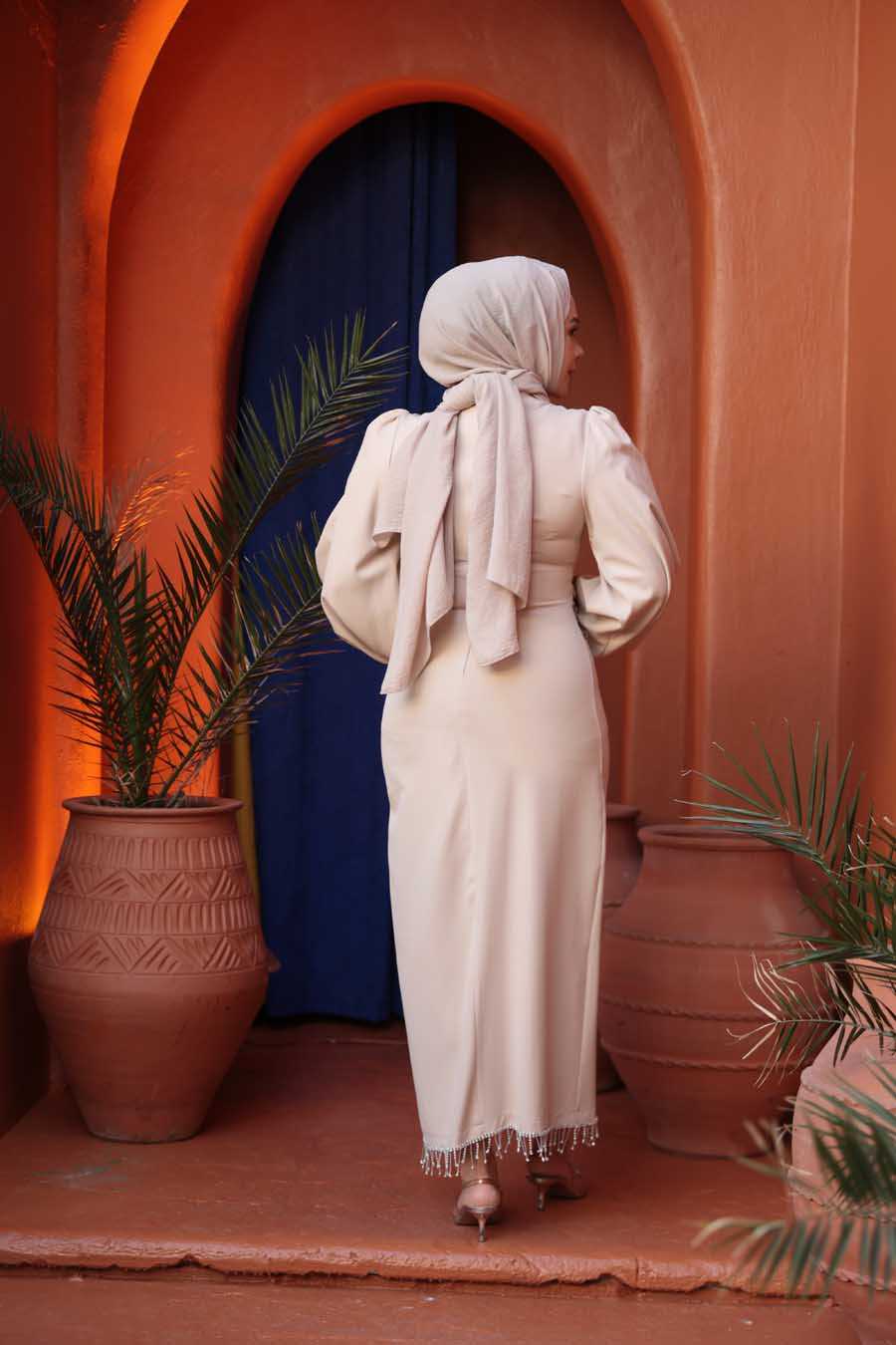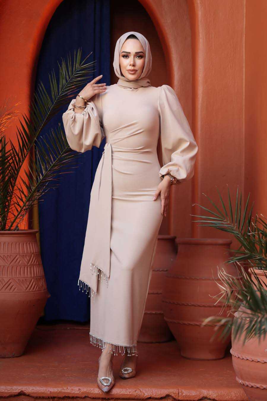 Modest Evening Dress - Balloon Sleeve Beige Modest Evening Dress 62251BEJ