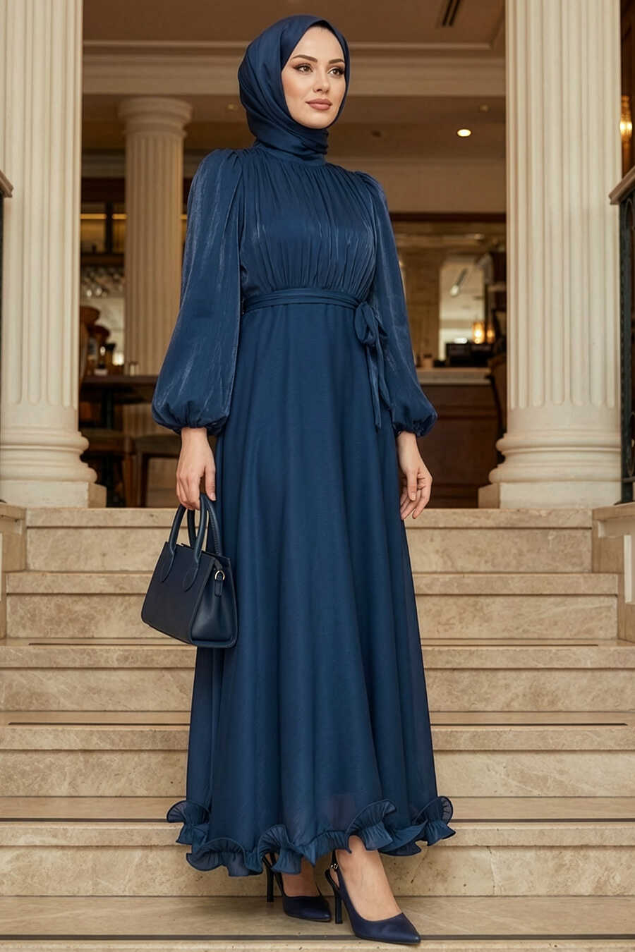 Modest Evening Dress - Balloon Sleeve Navy Blue Modest Evening Dress 6278L