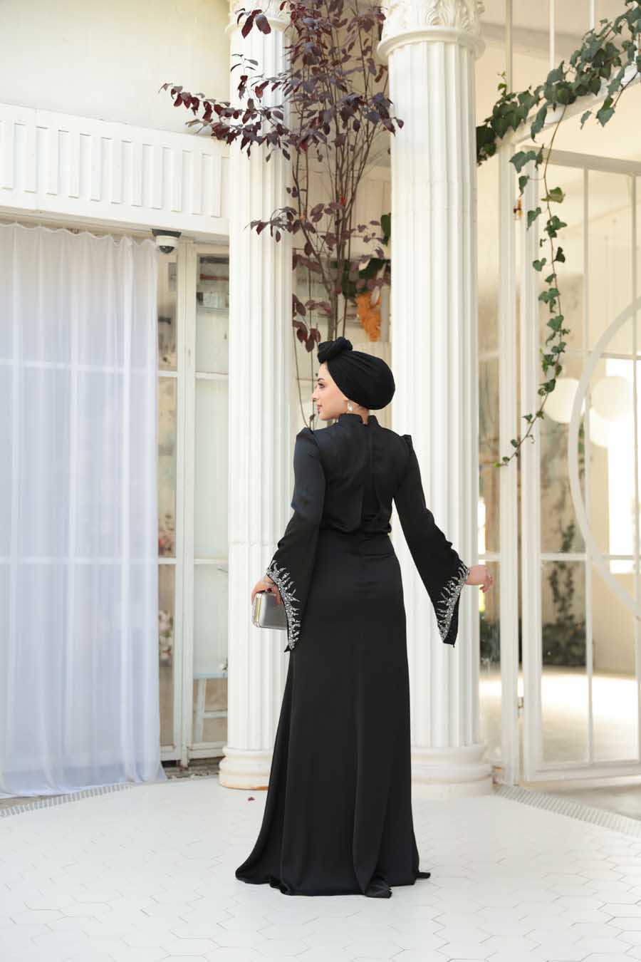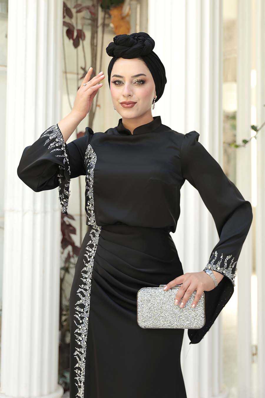 Modest Evening Dress - Bead Detailed Black Satin Modest Evening Dress 53361S