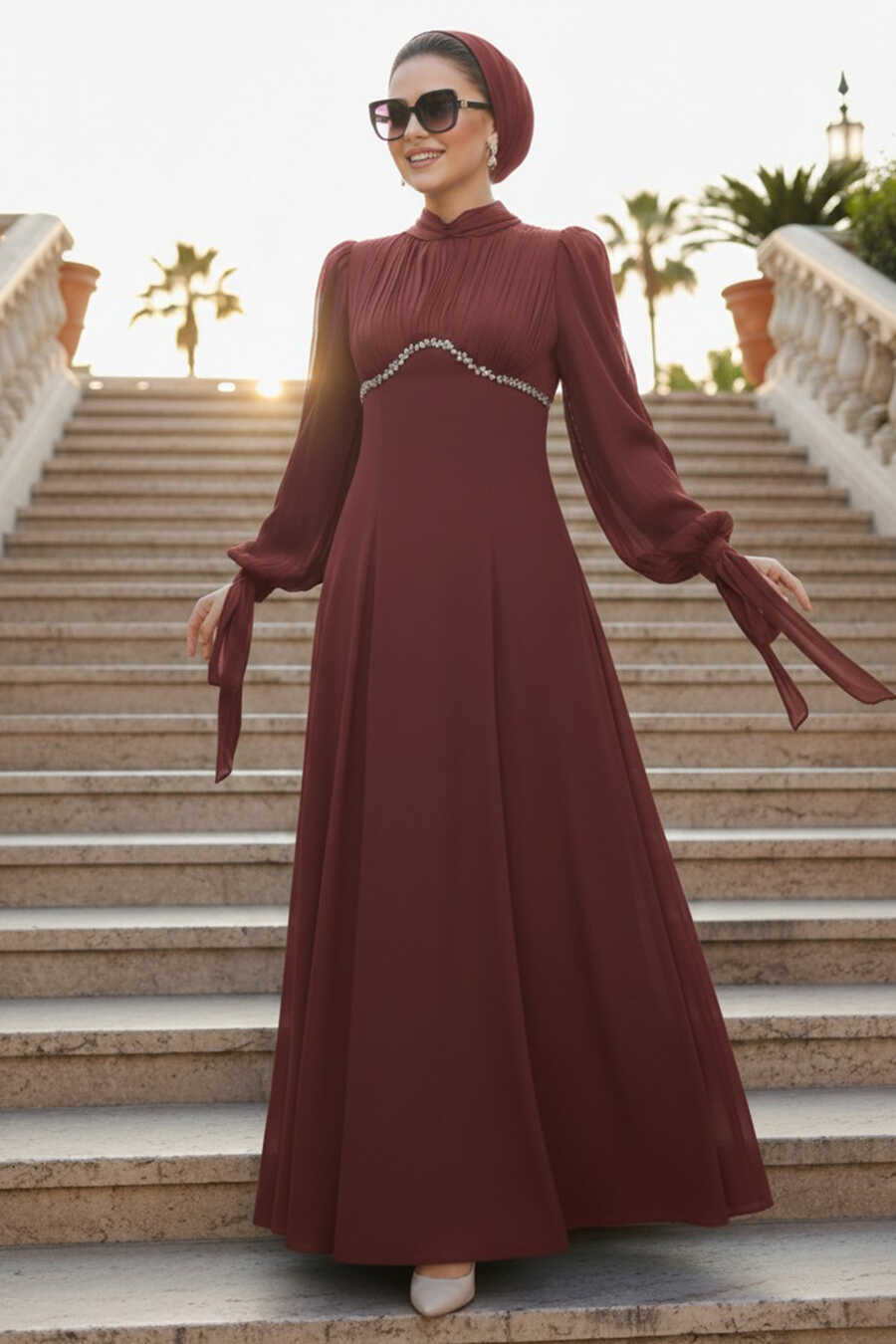 Modest Evening Dress - Bead Detailed Brown Modest Evening Dress 55701KH