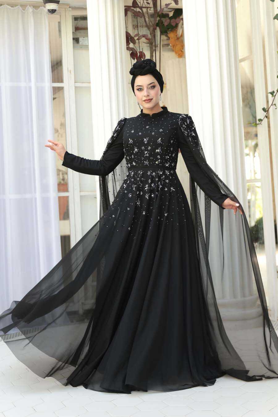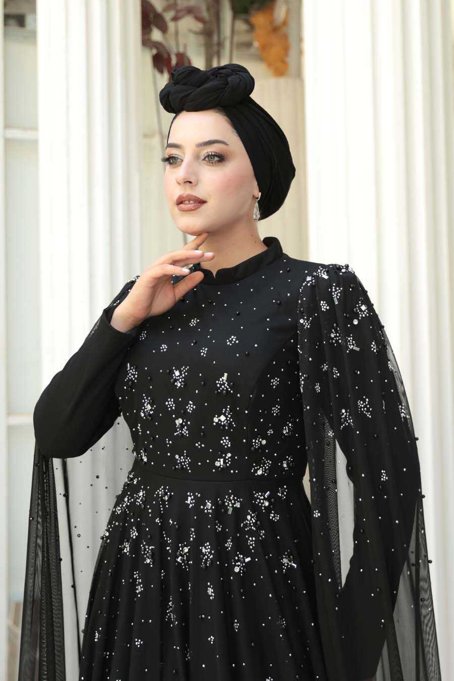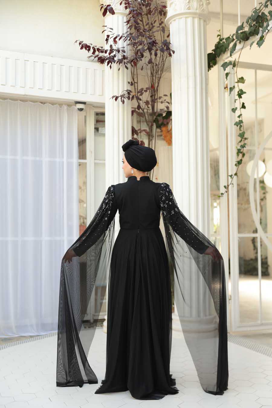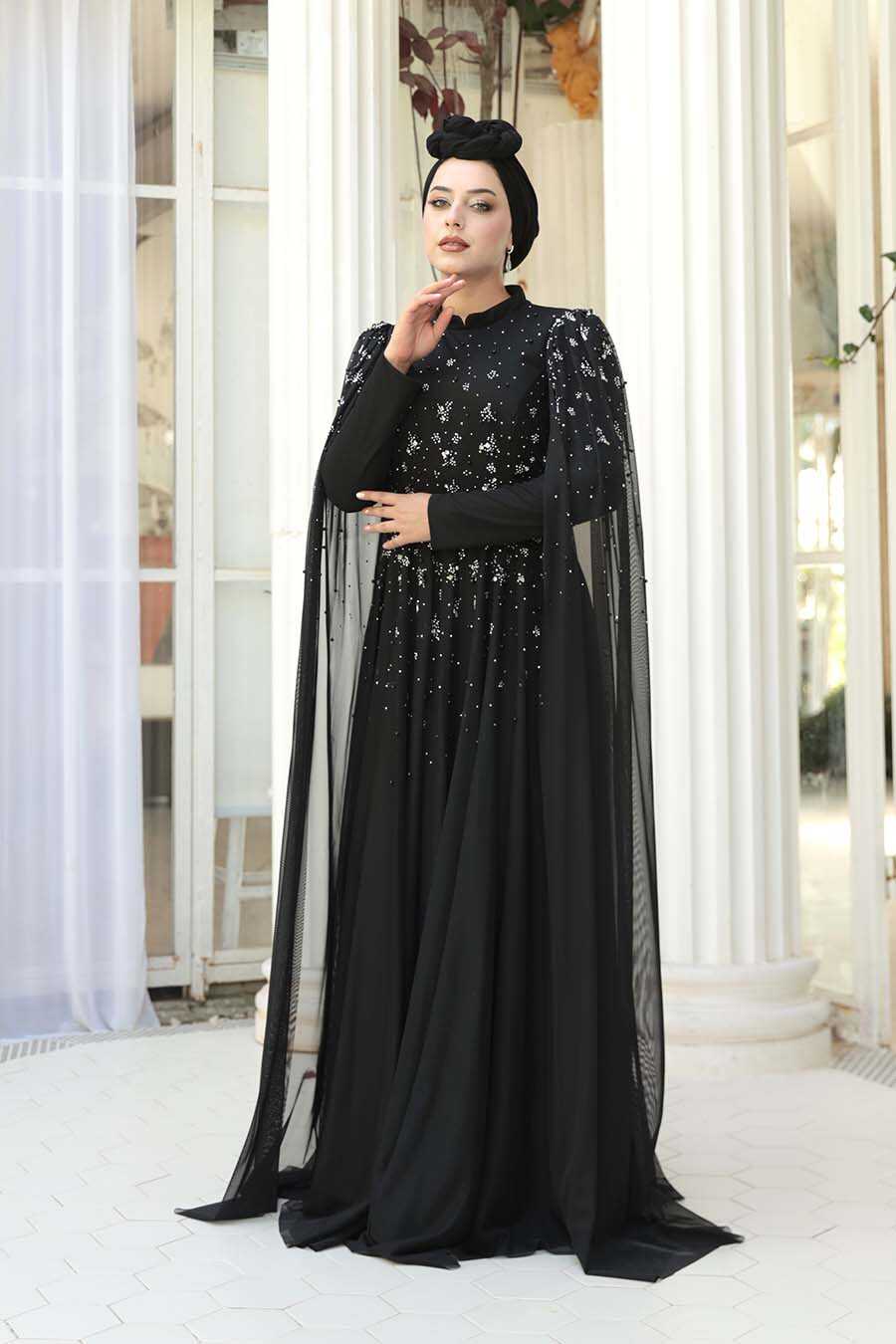 Modest Evening Dress - Bead Detailed Cape Black Modest Evening Dress 53141S