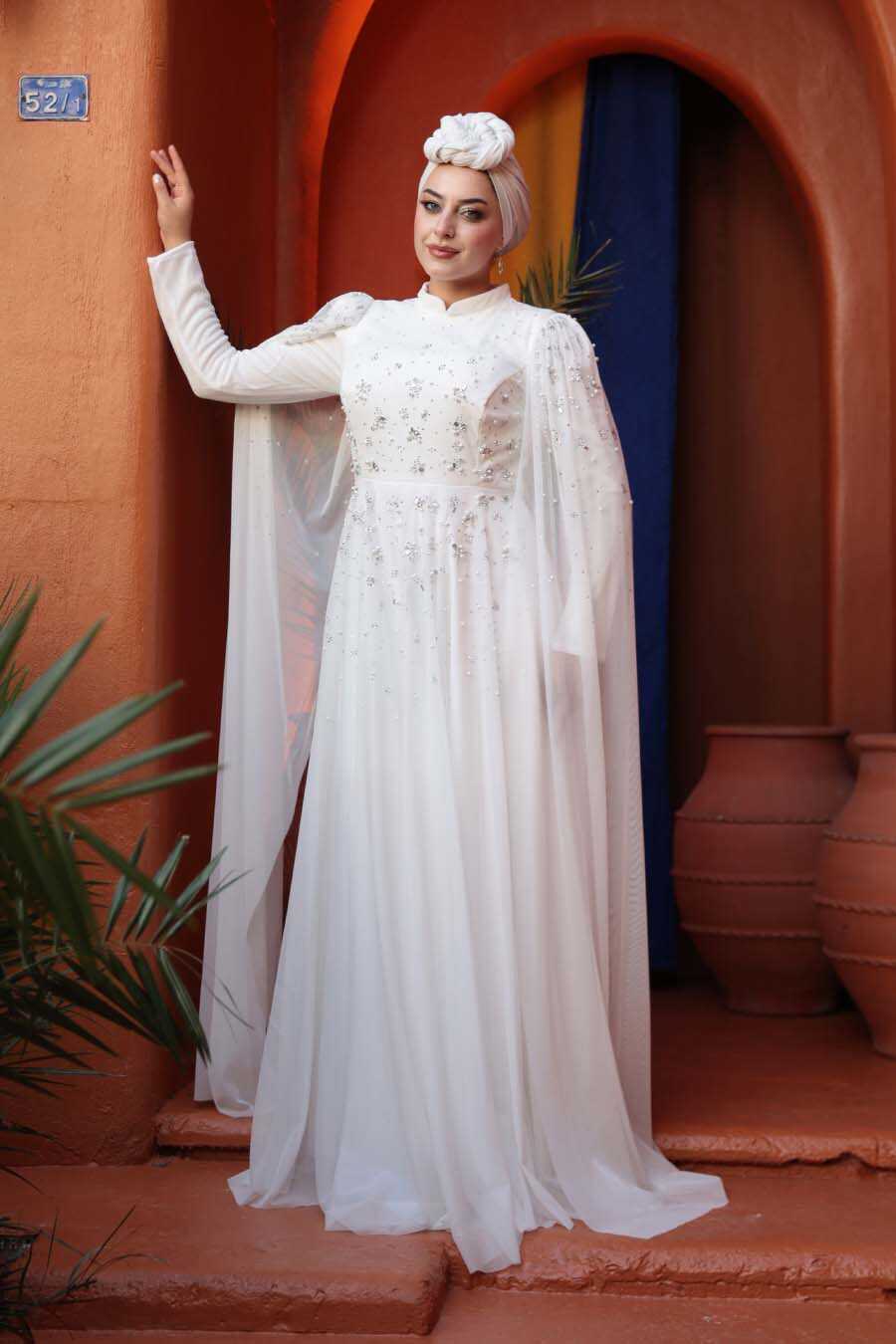 Modest Evening Dress - Bead Detailed Cape White Modest Evening Dress 53141B