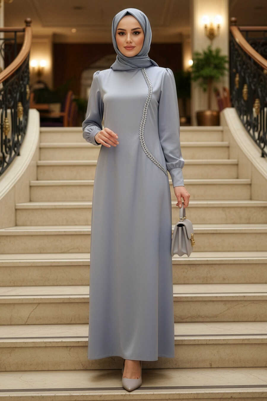 Modest Evening Dress - Bead Detailed Grey Modest Satin Evening Dress 62281GR