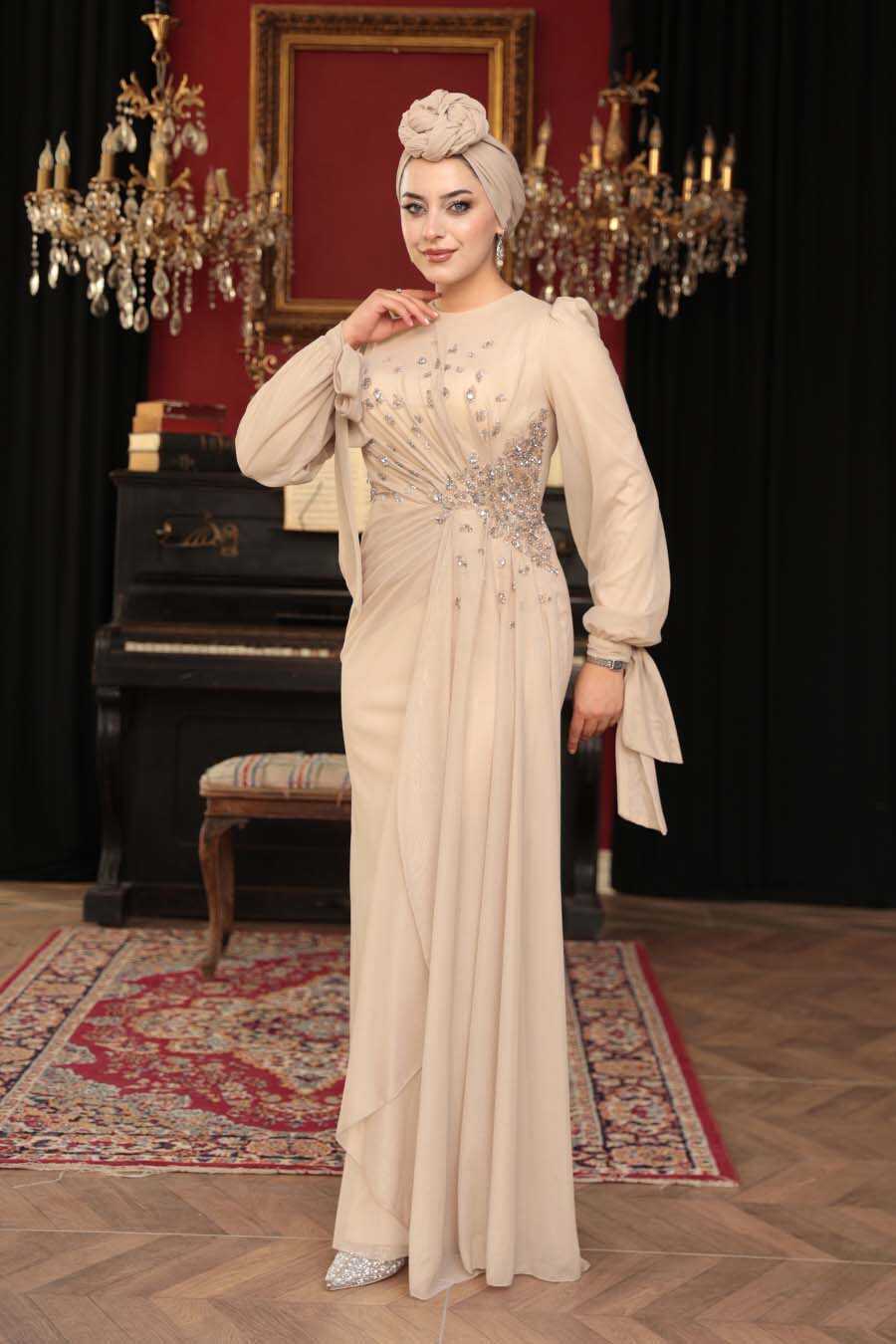 Modest Evening Dress - Bead Embellished Beige Modest Evening Dress 53497BEJ