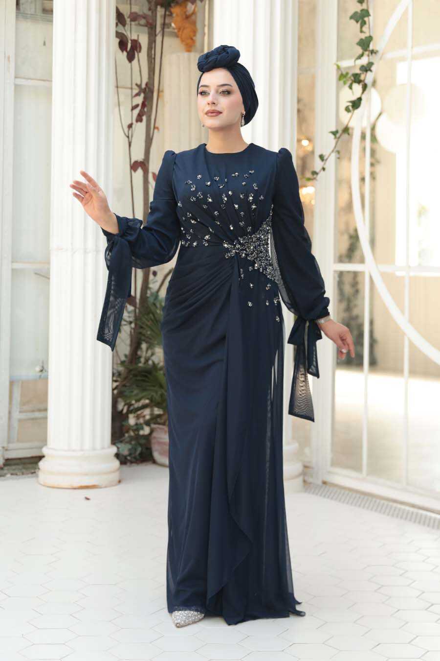 Modest Evening Dress - Bead Embellished Navy Modest Evening Dress 53497L