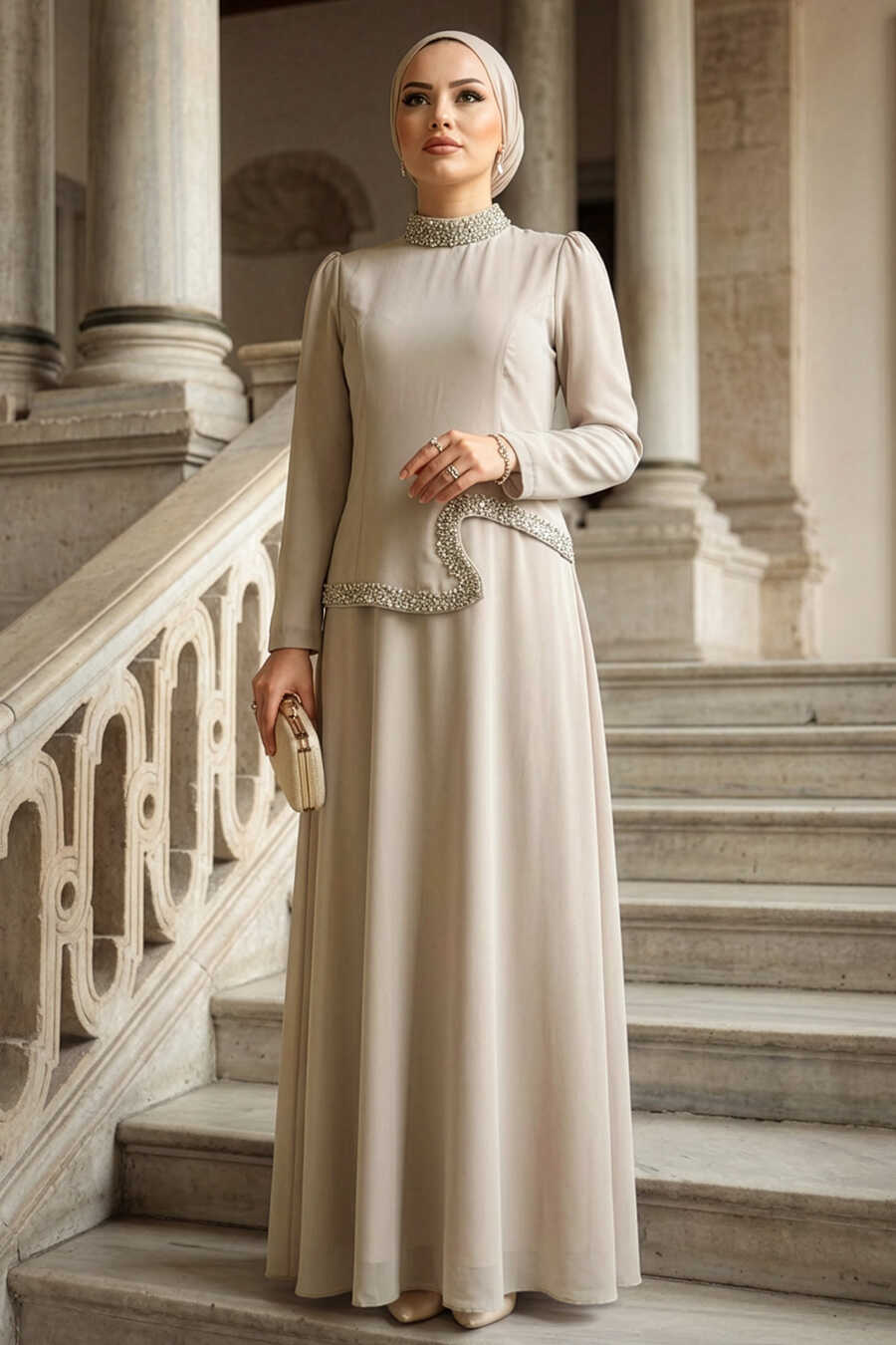 Modest Evening Dress - Bead Embroidered Beige Modest Evening Dress 48081BEJ