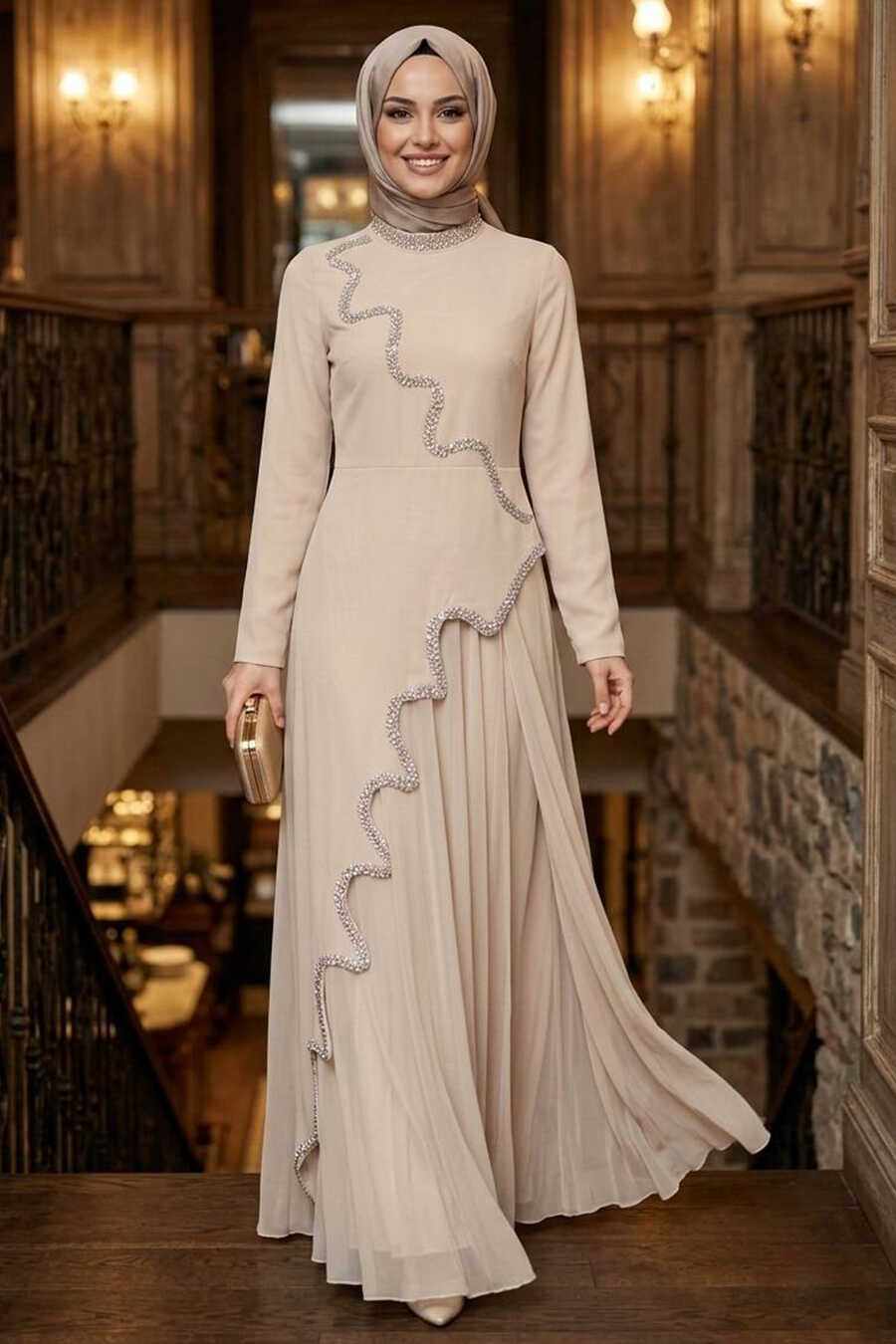 Modest Evening Dress - Bead Embroidered Beige Modest Evening Dress 55741BEJ