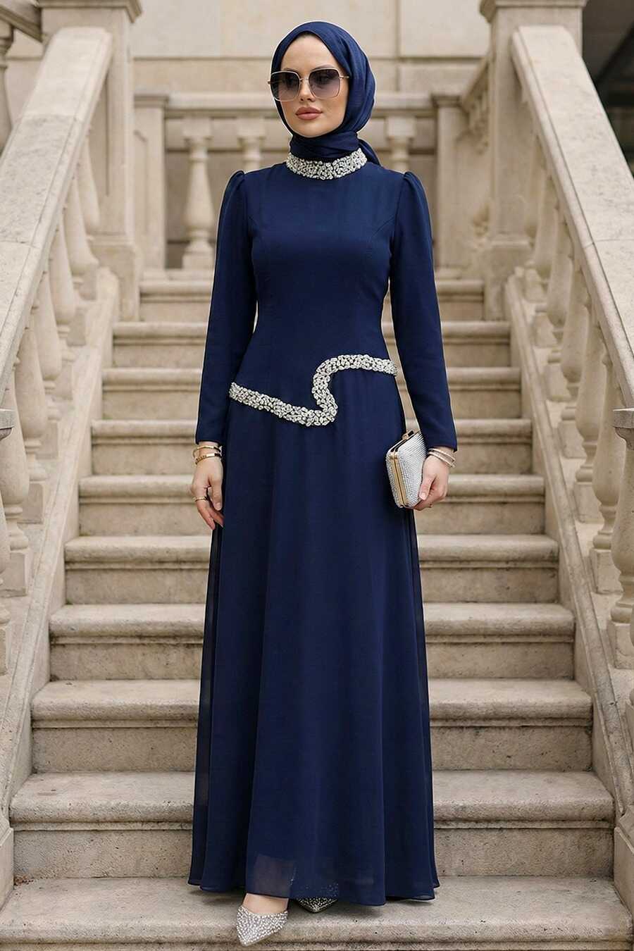 Modest Evening Dress - Bead Embroidered Navy Blue Modest Evening Dress 48081L