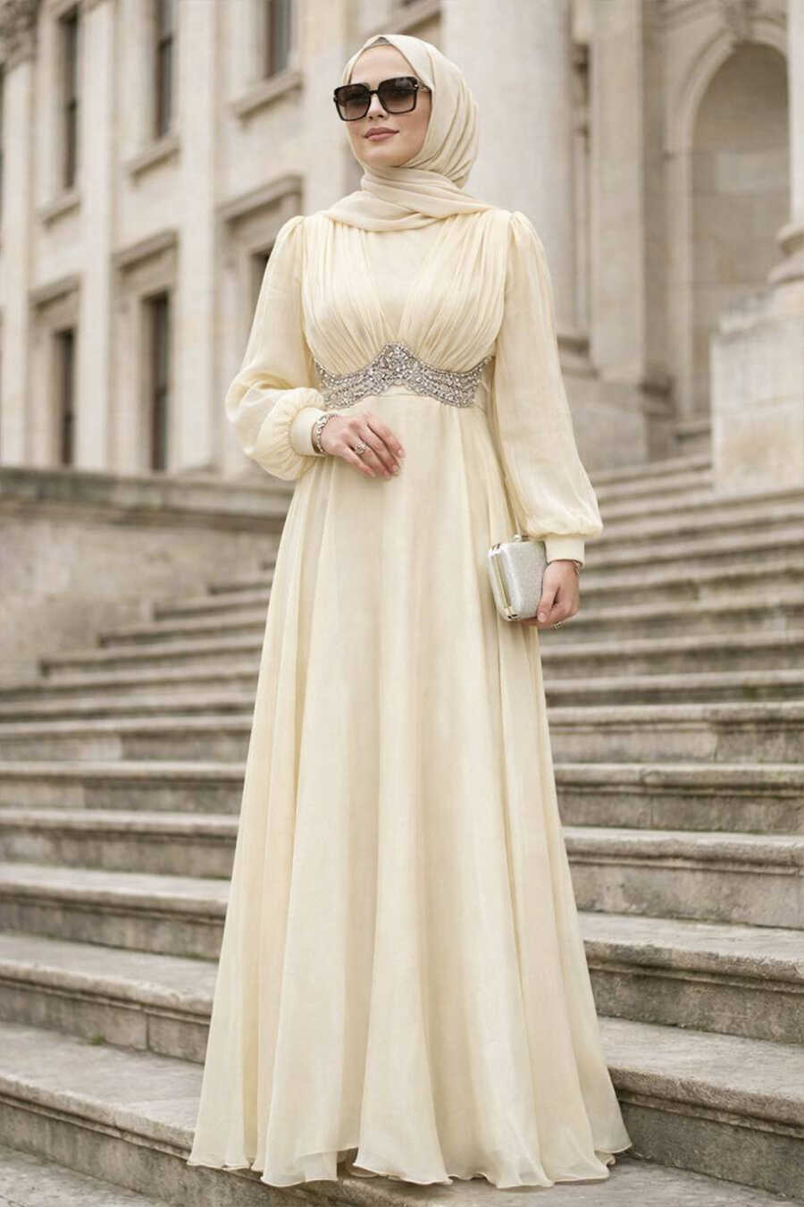 Modest Evening Dress - Beaded Detail Ecru Modest Evening Dress 4876E