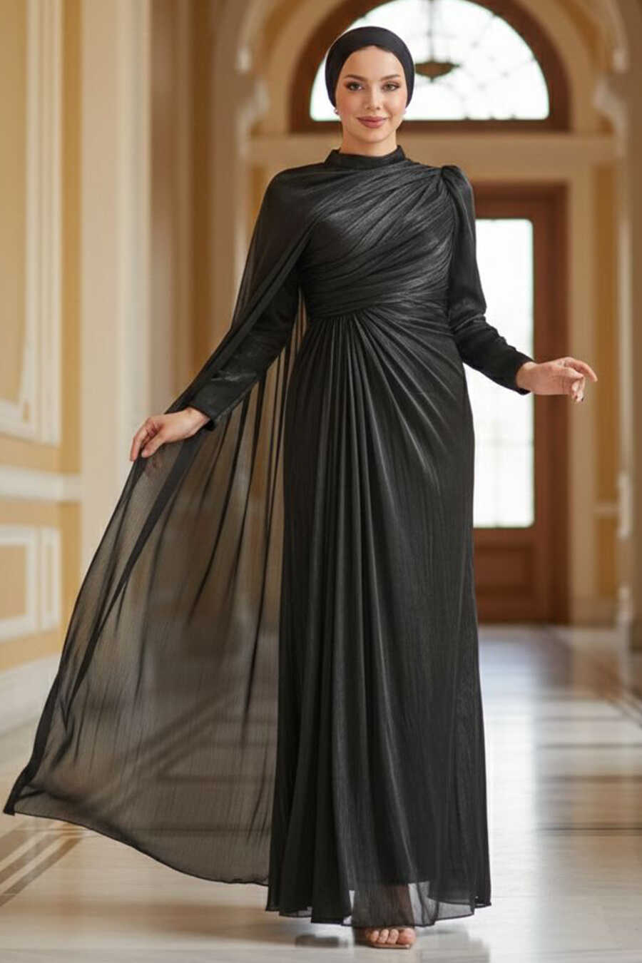 Modest Evening Dress - Cape Detailed Black Modest Evening Dress 52142S