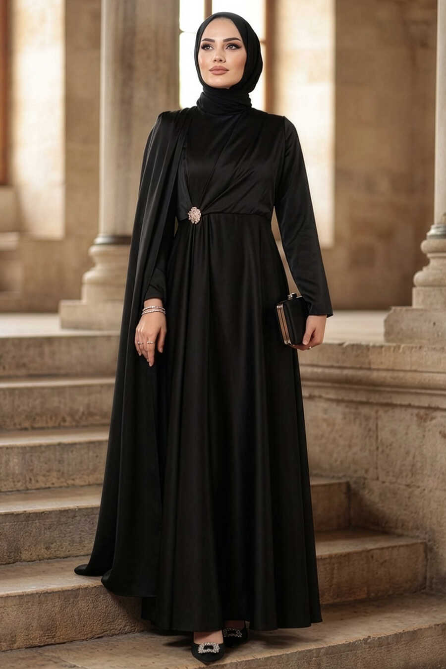 Modest Evening Dress - Cape Detailed Black Modest Satin Evening Dress 4884S