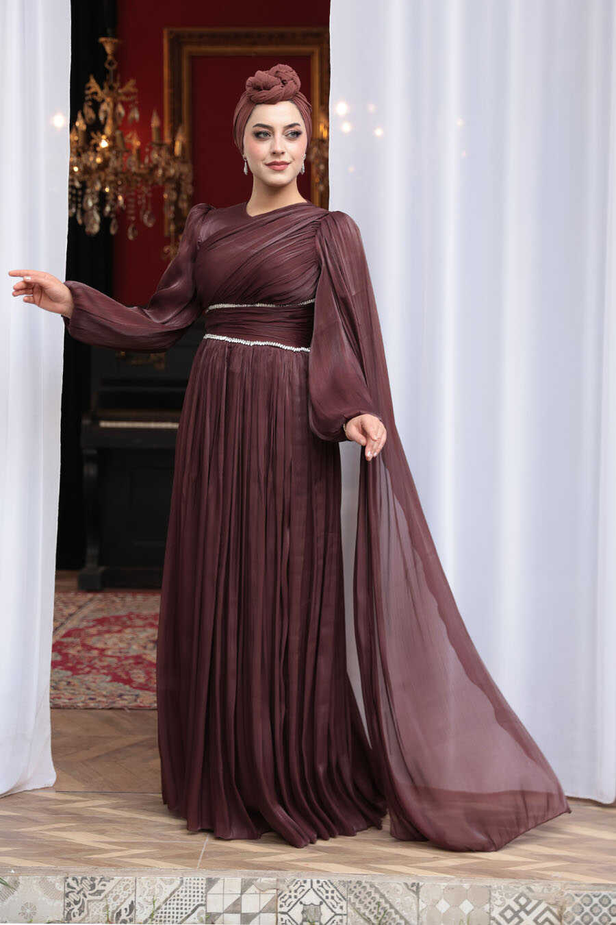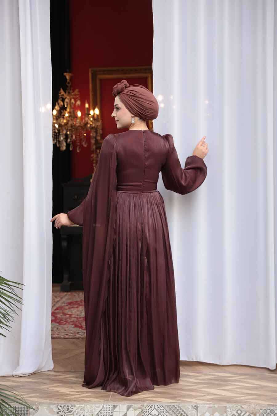 Modest Evening Dress - Cape Detailed Brown Modest Evening Dress 53021KH