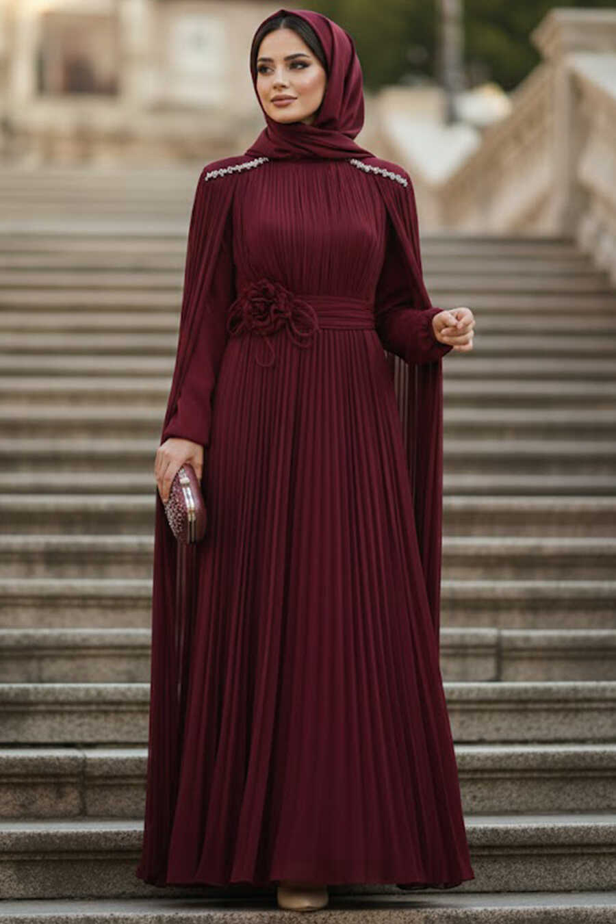 Modest Evening Dress - Cape Detailed Claret Red Modest Evening Dress 54331BR