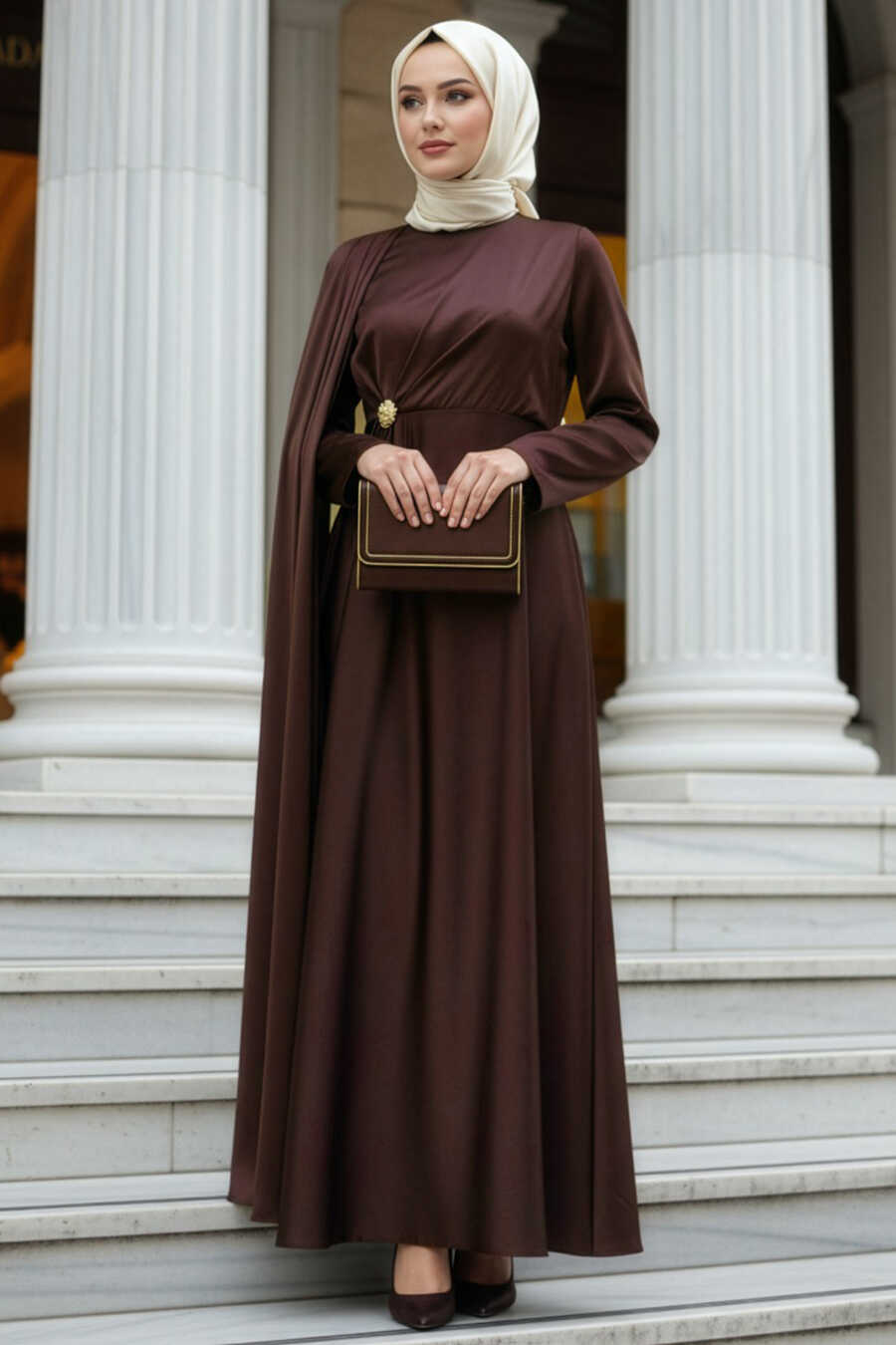 Modest Evening Dress - Cape Detailed Dark Brown Modest Satin Evening Dress 4884KKH