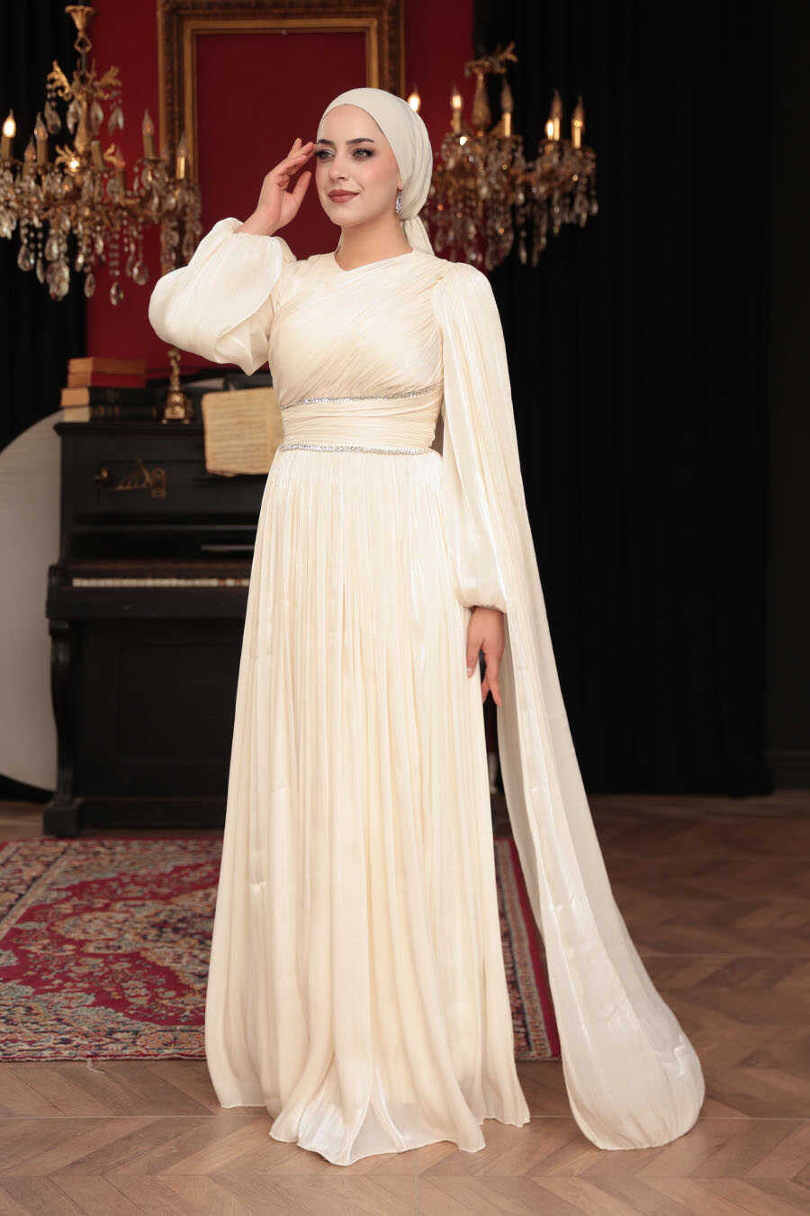 Modest Evening Dress - Cape Detailed Ecru Modest Evening Dress 53021E