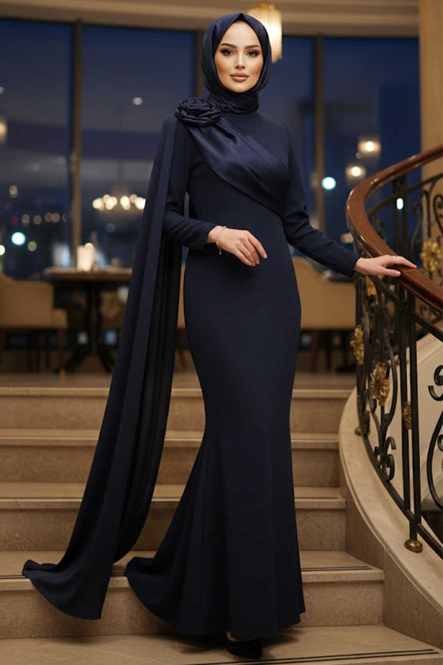 Modest Evening Dress - Cape Detailed Navy Blue Modest Evening Dress 57913L