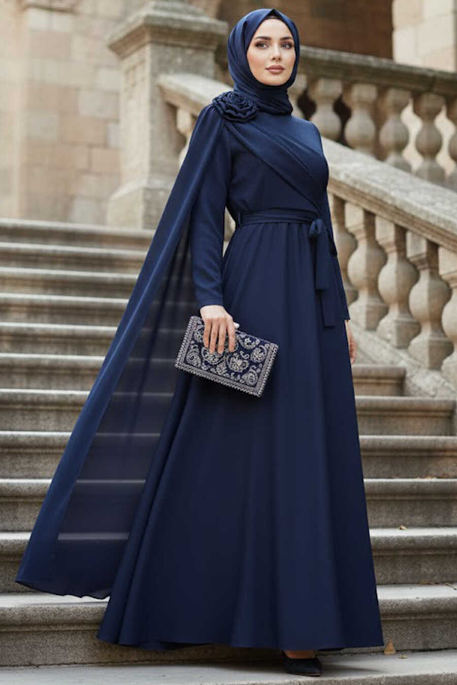 Modest Evening Dress - Cape Detailed Navy Blue Modest Evening Dress 57915L