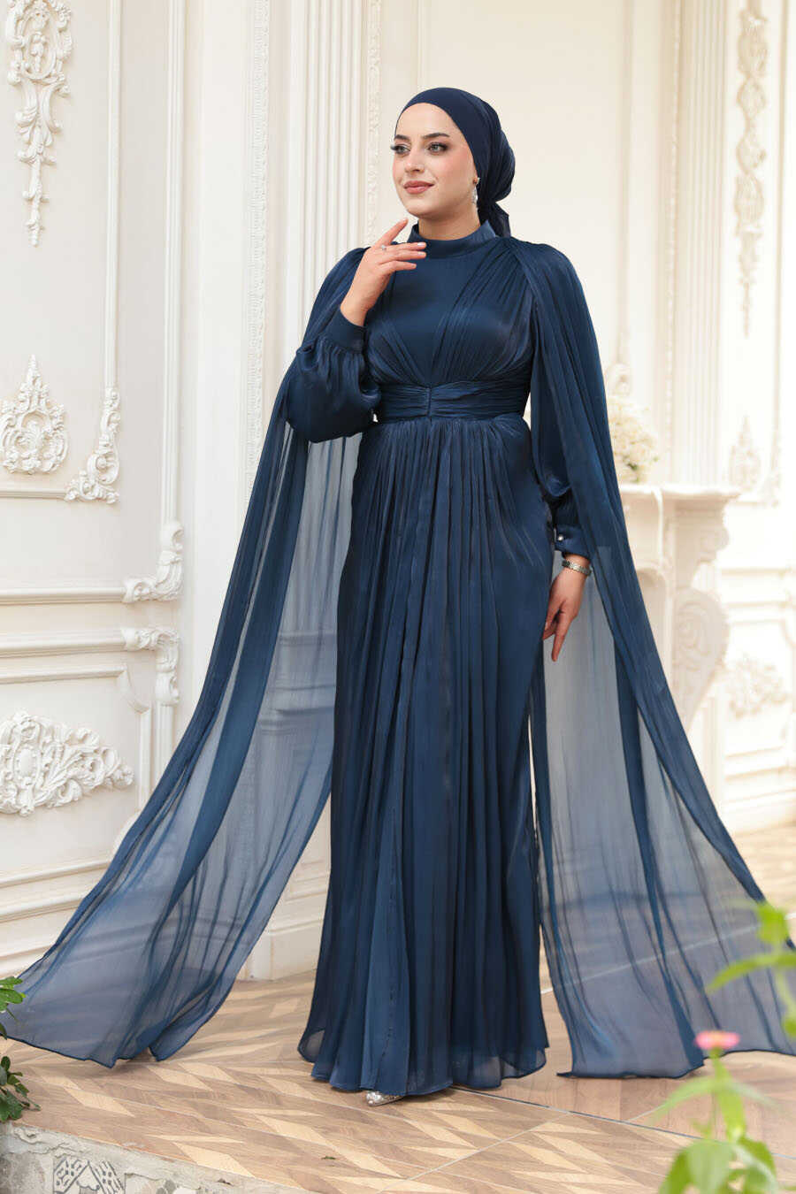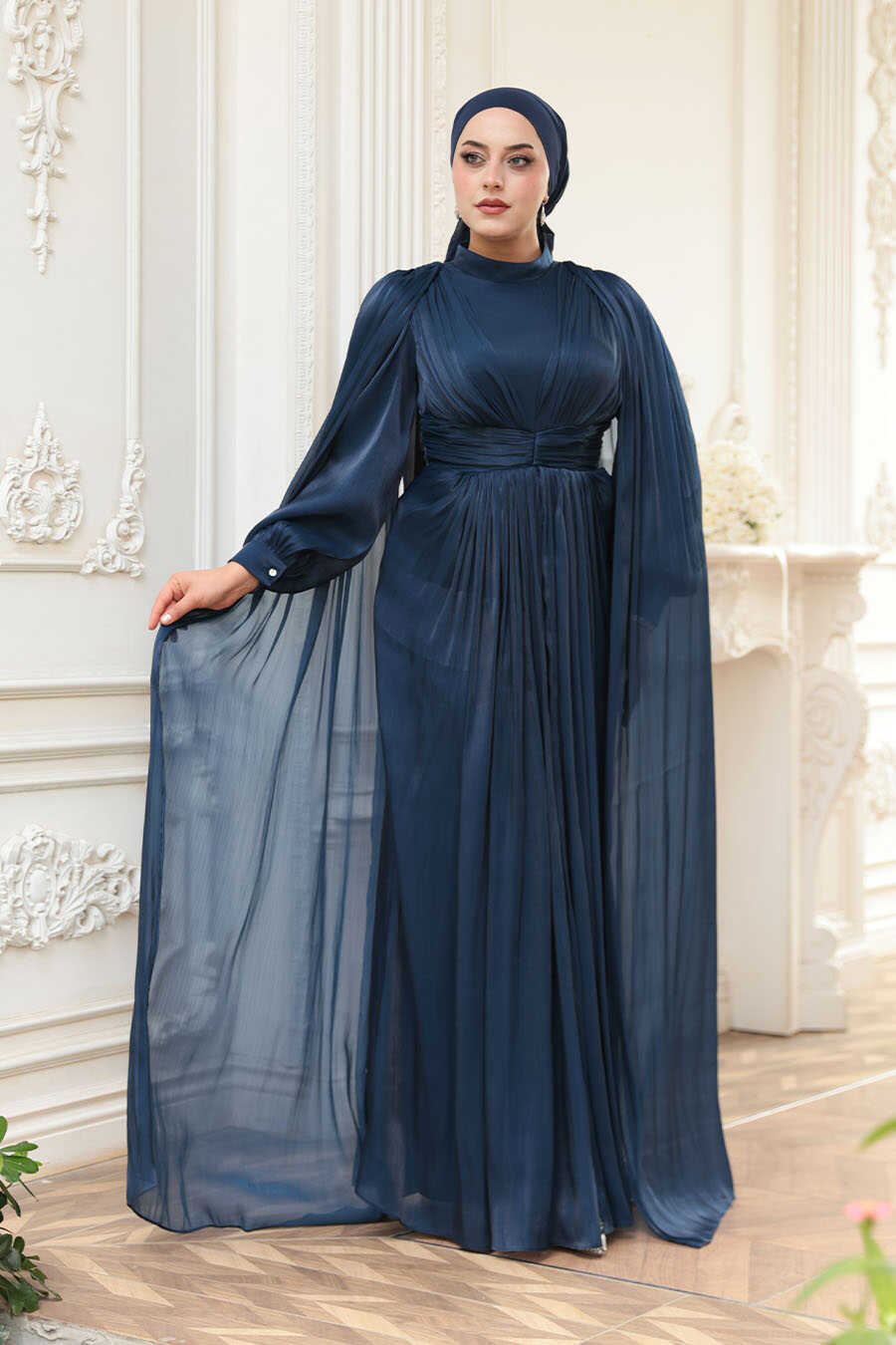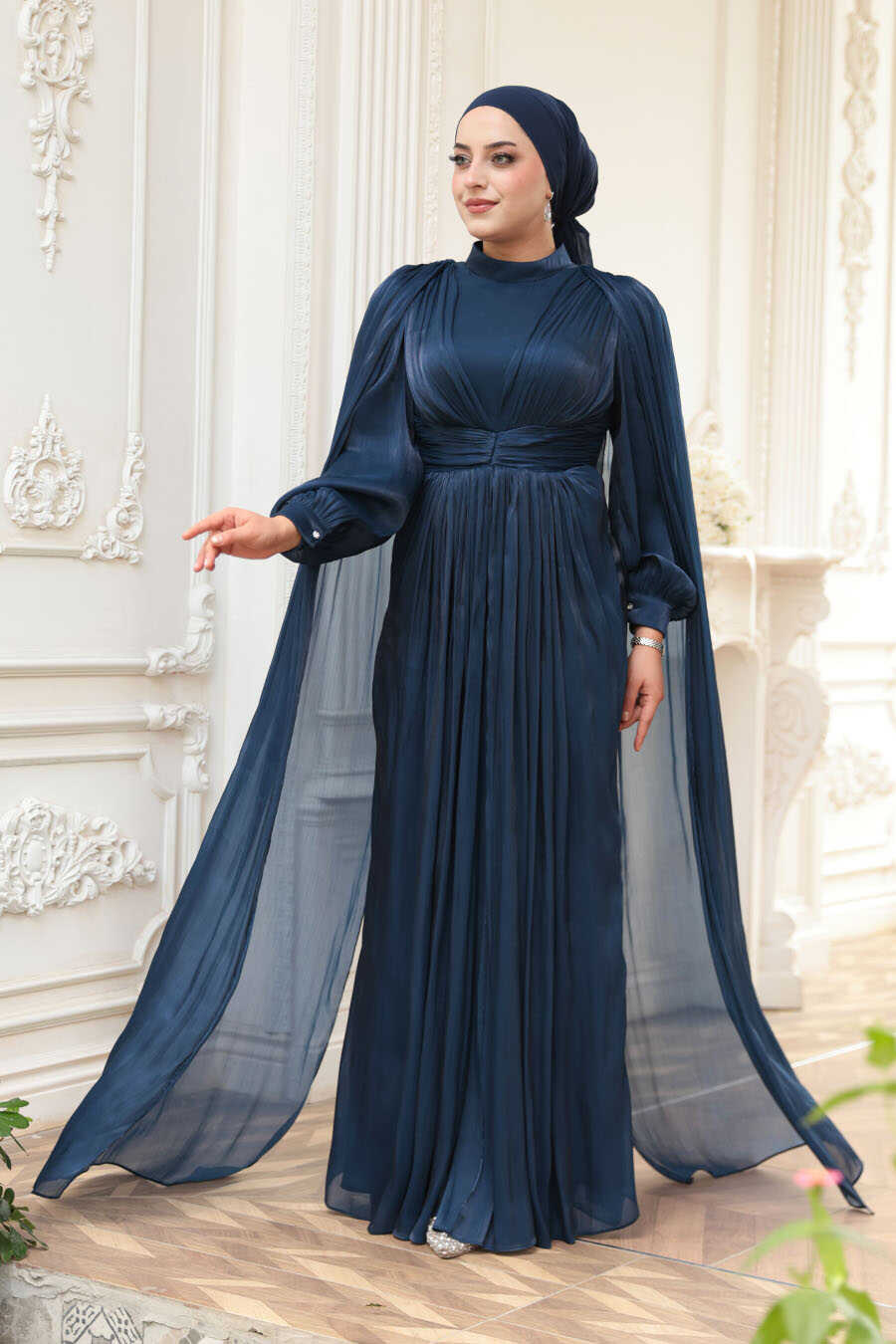 Modest Evening Dress - Cape Detail Navy Blue Modest Evening Dress 5447L
