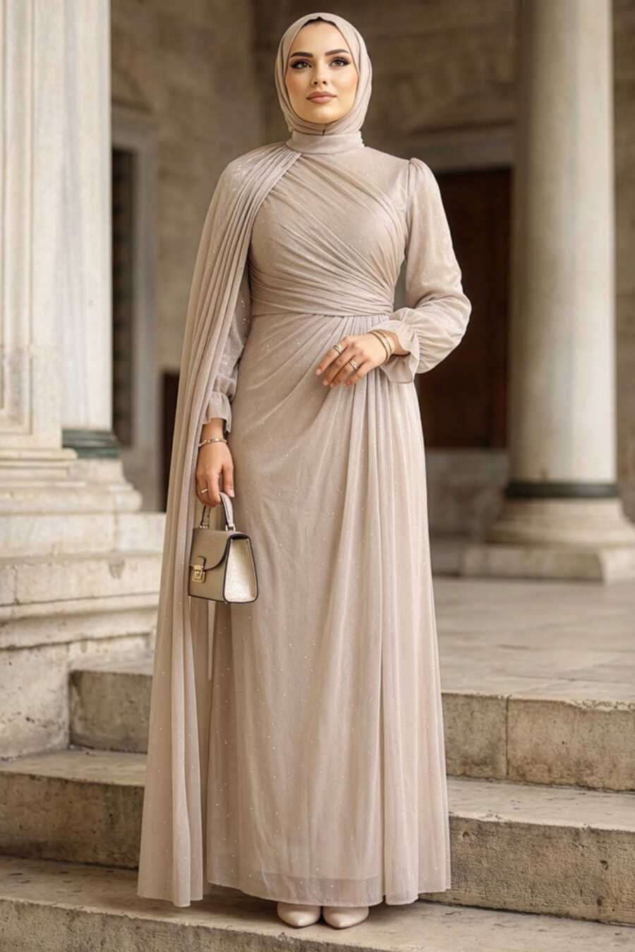 Modest Evening Dress - Cape Detailed Stone Modest Evening Dress 4875TAS