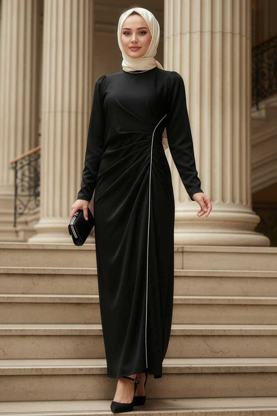 Modest Evening Dress - Drape Detailed Black Modest Satin Evening Dress 46681S