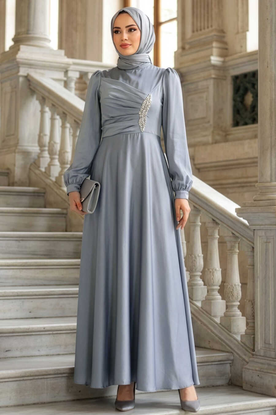 Modest Evening Dress - Drape Detailed Grey Modest Satin Evening Dress 6261GR