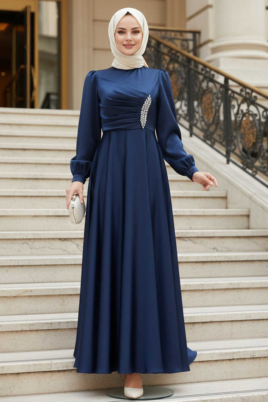Modest Evening Dress - Drape Detailed Navy Blue Modest Satin Evening Dress 6261L