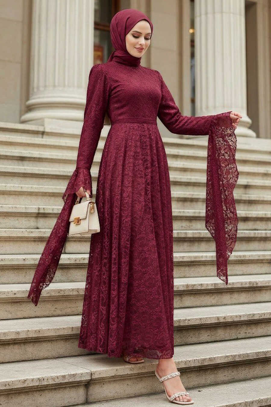 Modest Evening Dress - Lace Detail Burgundy Modest Evening Dress 6294BR