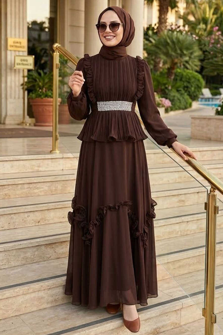 Modest Evening Dress - Ruffle Detail Brown Modest Evening Dress 4881KH