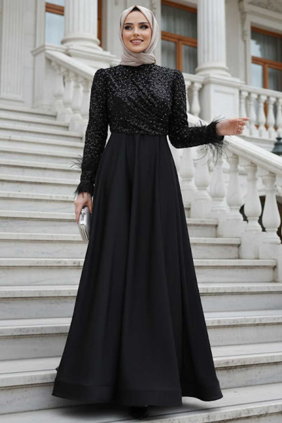 Modest Evening Dress - Sequin Bead Embroidered Black Modest Evening Dress 47963S