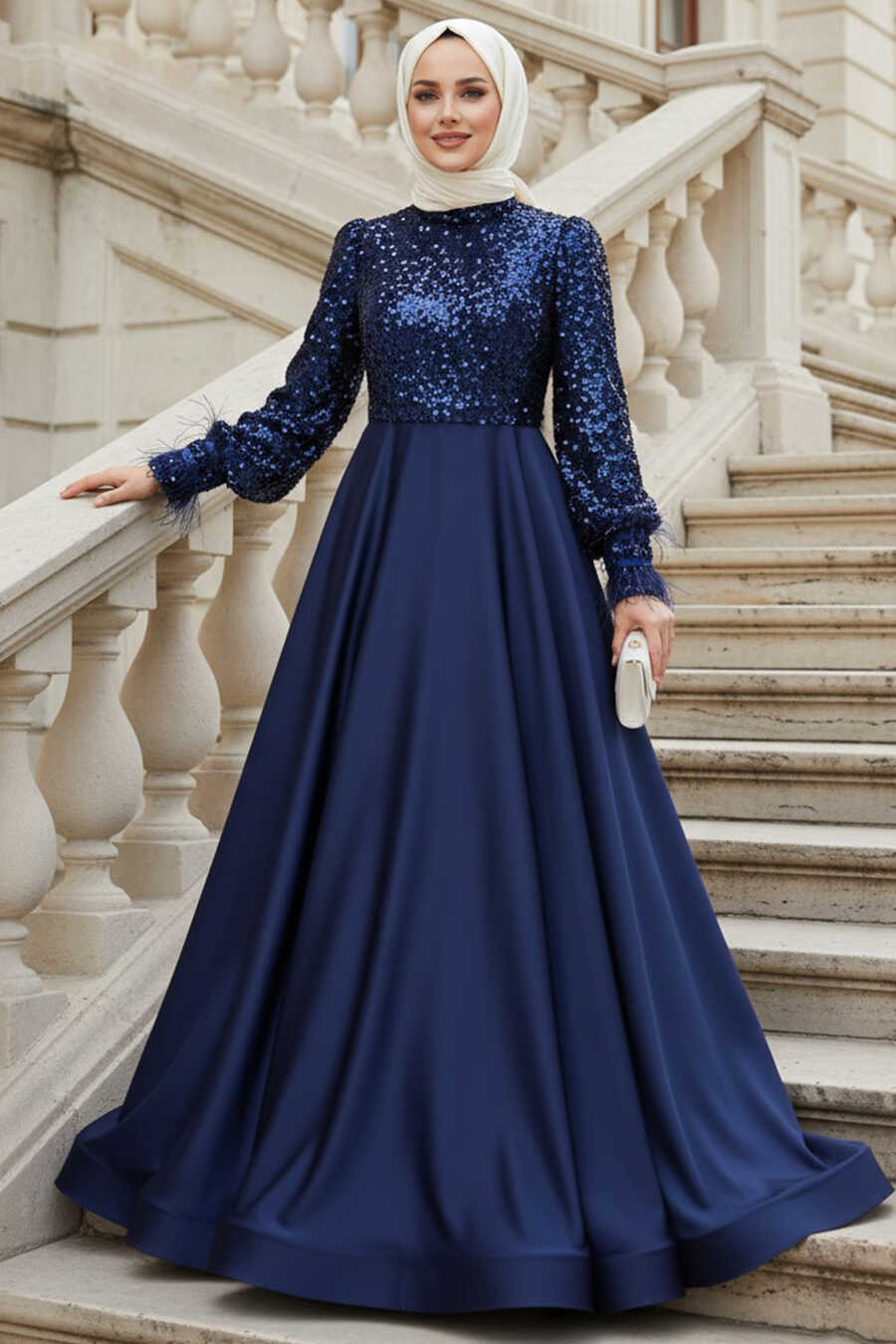 Modest Evening Dress - Sequin Bead Embroidered Navy Blue Modest Evening Dress 47963L