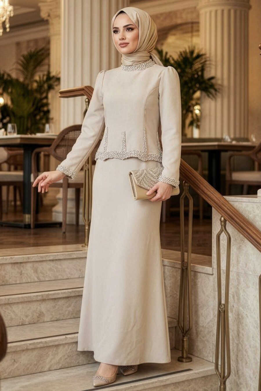 Modest Evening Dress - Stone Bead Embroidered Beige Modest Evening Dress 4861BEJ