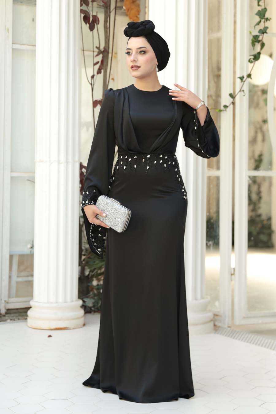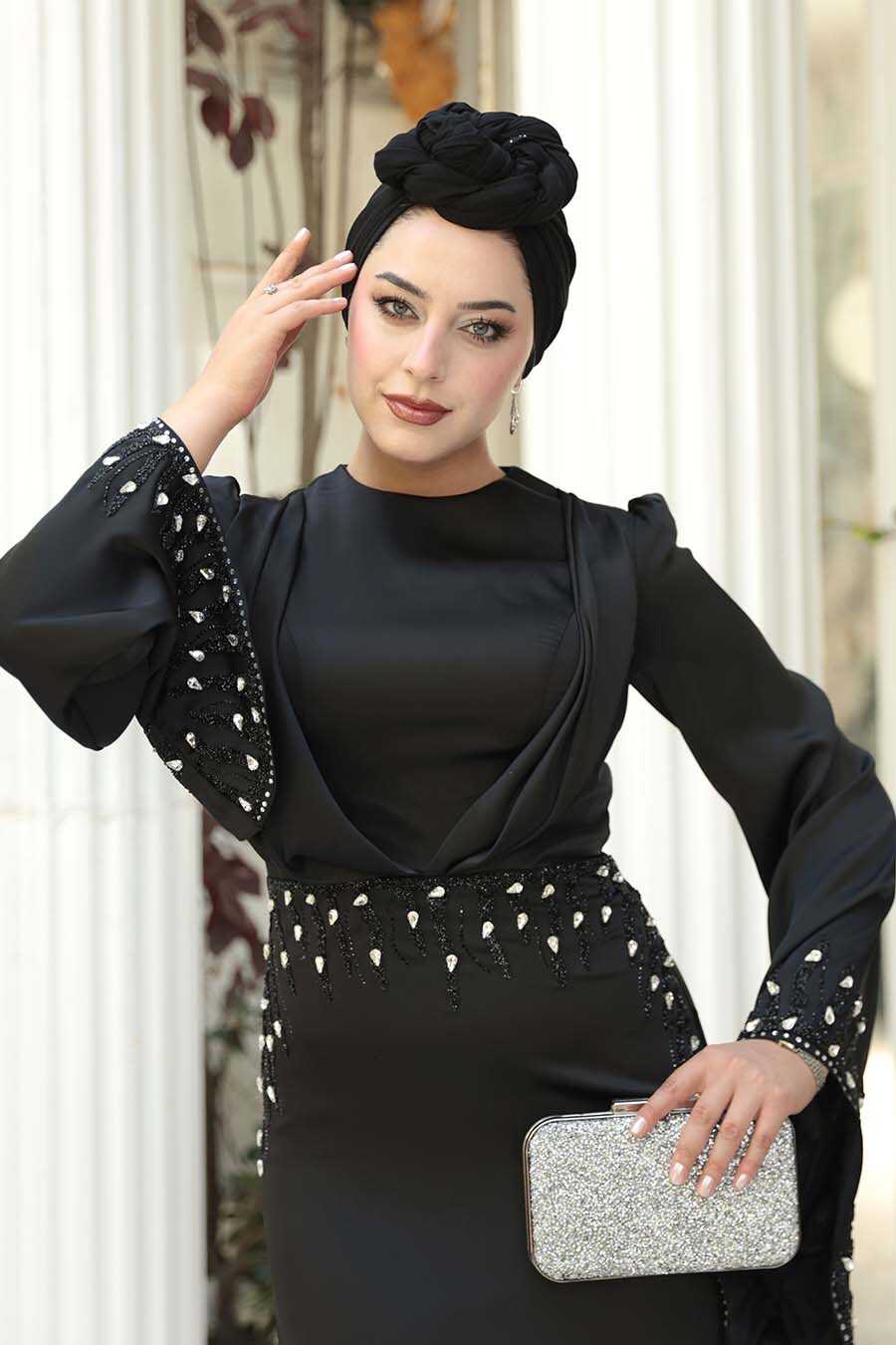Modest Evening Dress - Stone Embellished Black Satin Modest Evening Dress 5337S