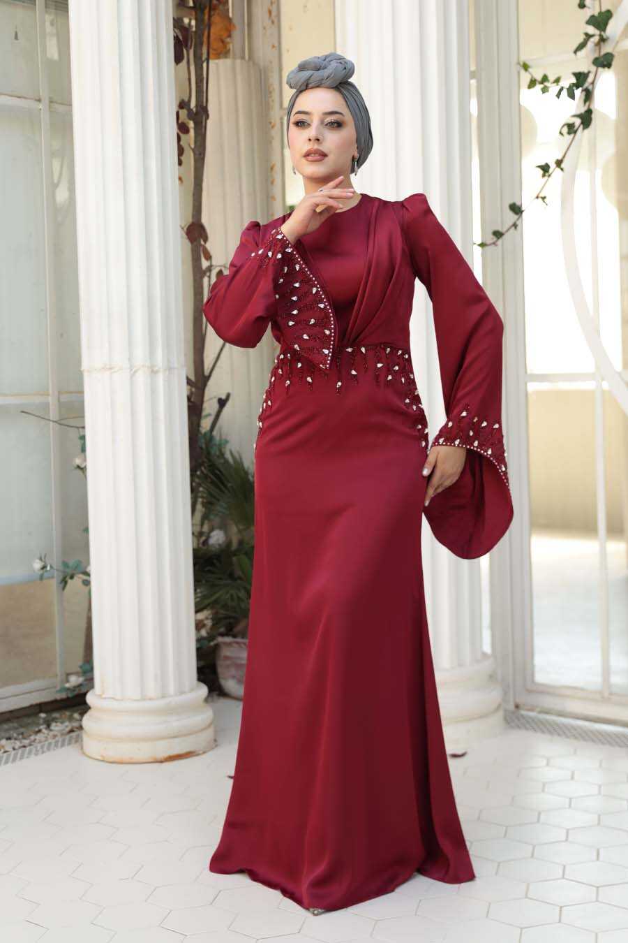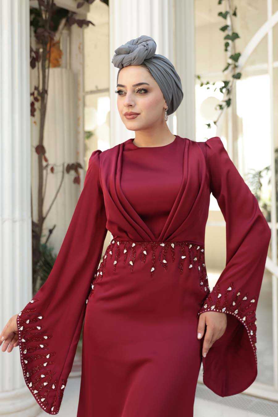 Modest Evening Dress - Stone Embellished Burgundy Satin Modest Evening Dress 5337BR