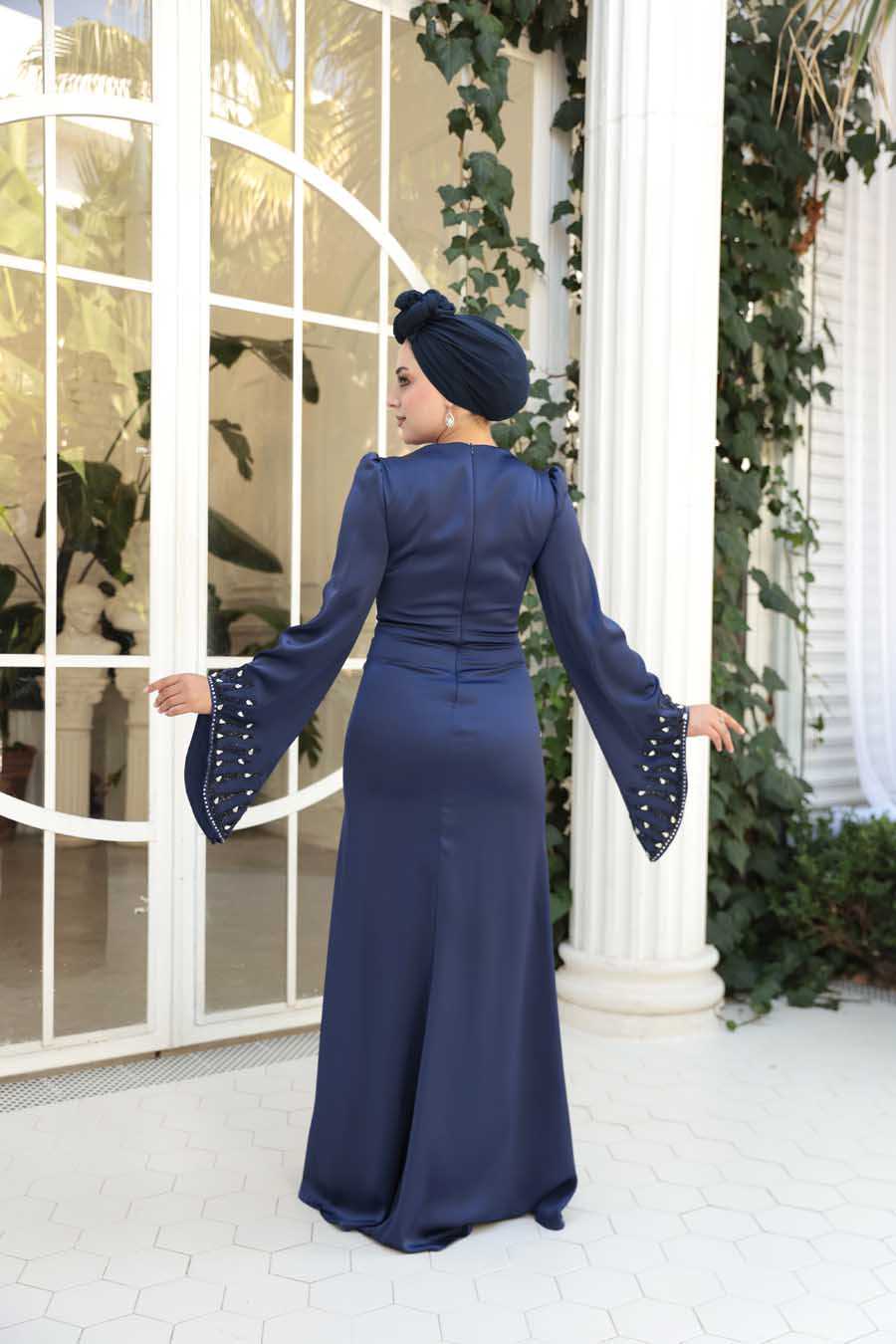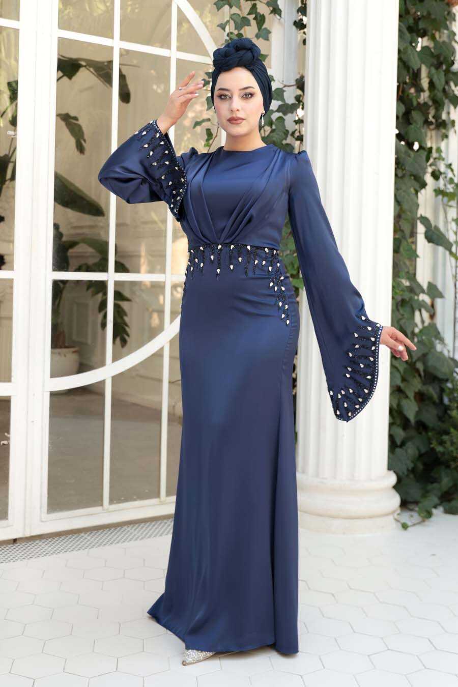 Modest Evening Dress - Stone Embellished Navy Satin Modest Evening Dress 5337L